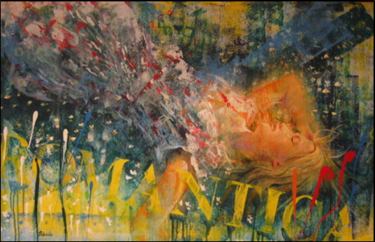DELVECCHIO MAURIZIO Basilea 1962 "Romantica" Olio su tela cm 110x70. Firmato sul fronte in basso a sinistra. Autentica su foto del Maestro.