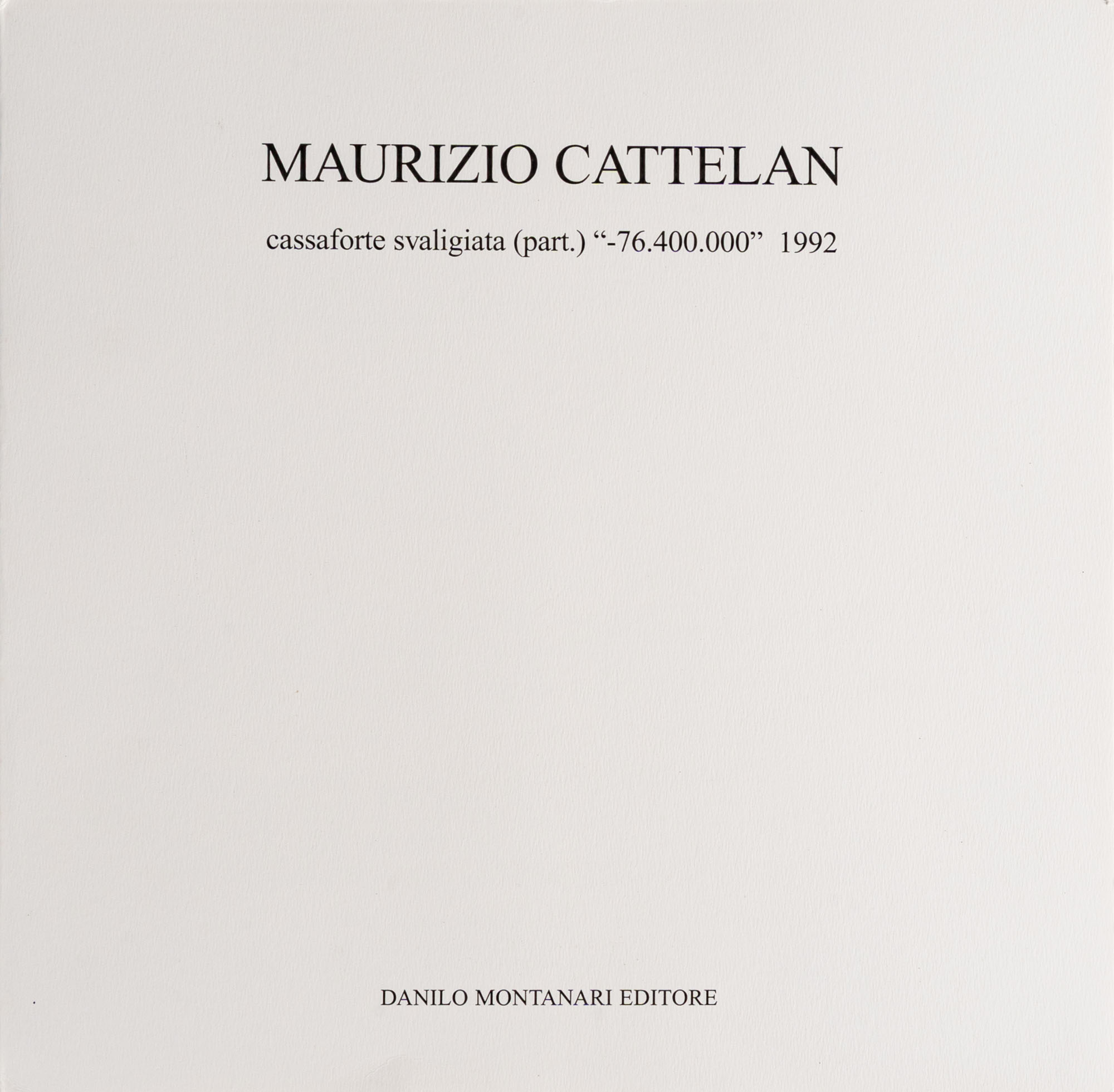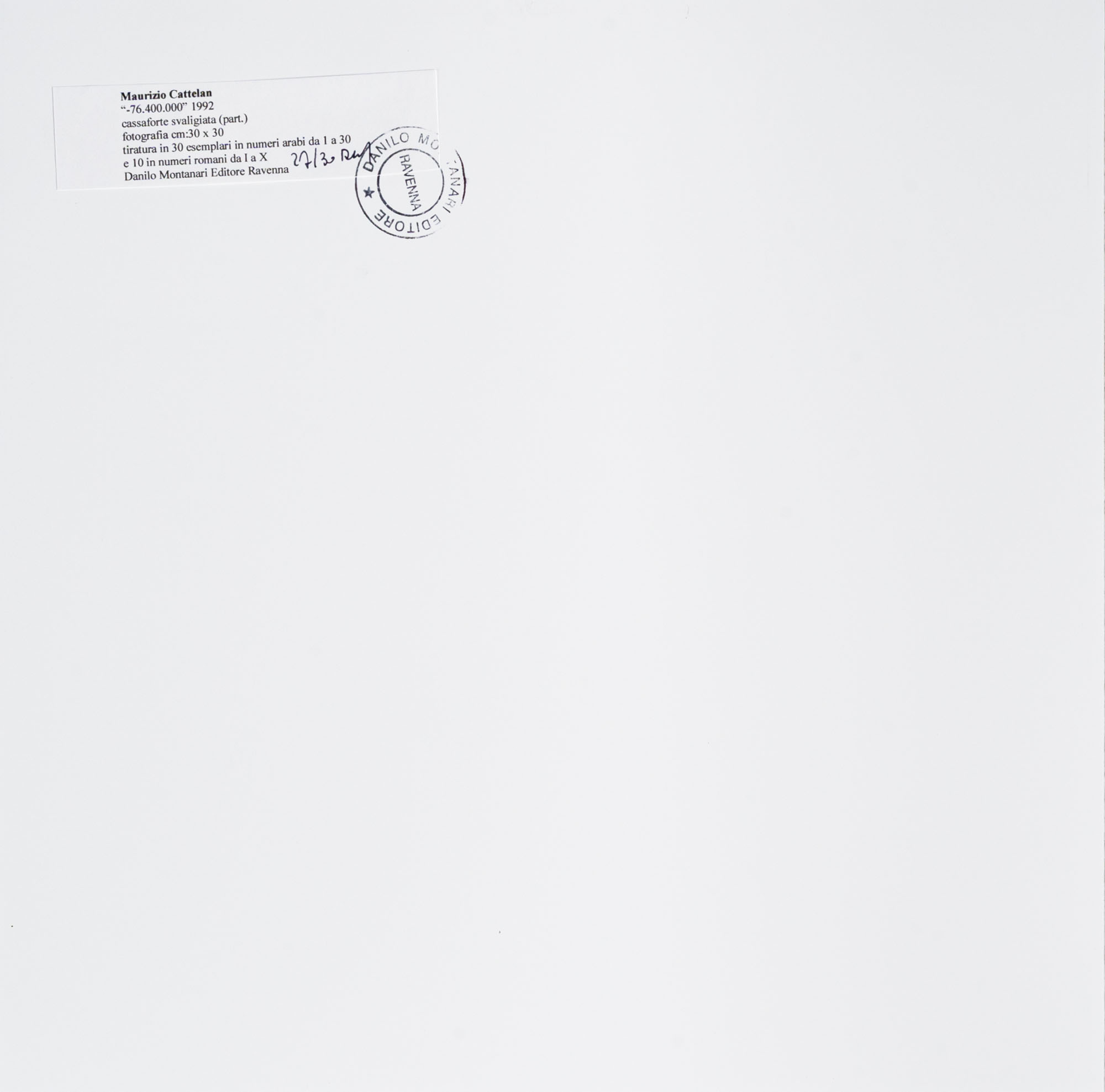MAURIZIO CATTELAN(1960)Cassaforte svaligiata (part.) - 76.400.0001992Cartella contenente una stampa cibachrome, es. 27/30 su una tiratura complessiva di 30 esemplari in numeri arabi e 10 in numeri romani, Danilo Montanari Editore, RavennaDimensioni della cartella: 31 x 31 cmDimensioni della stampa cibachrome: 30 x 30 cmTimbro e firma Danilo Montanari Editore e numerazione al retro della stampa cibachromePROVENIENZA:Collezione privata, Lecco