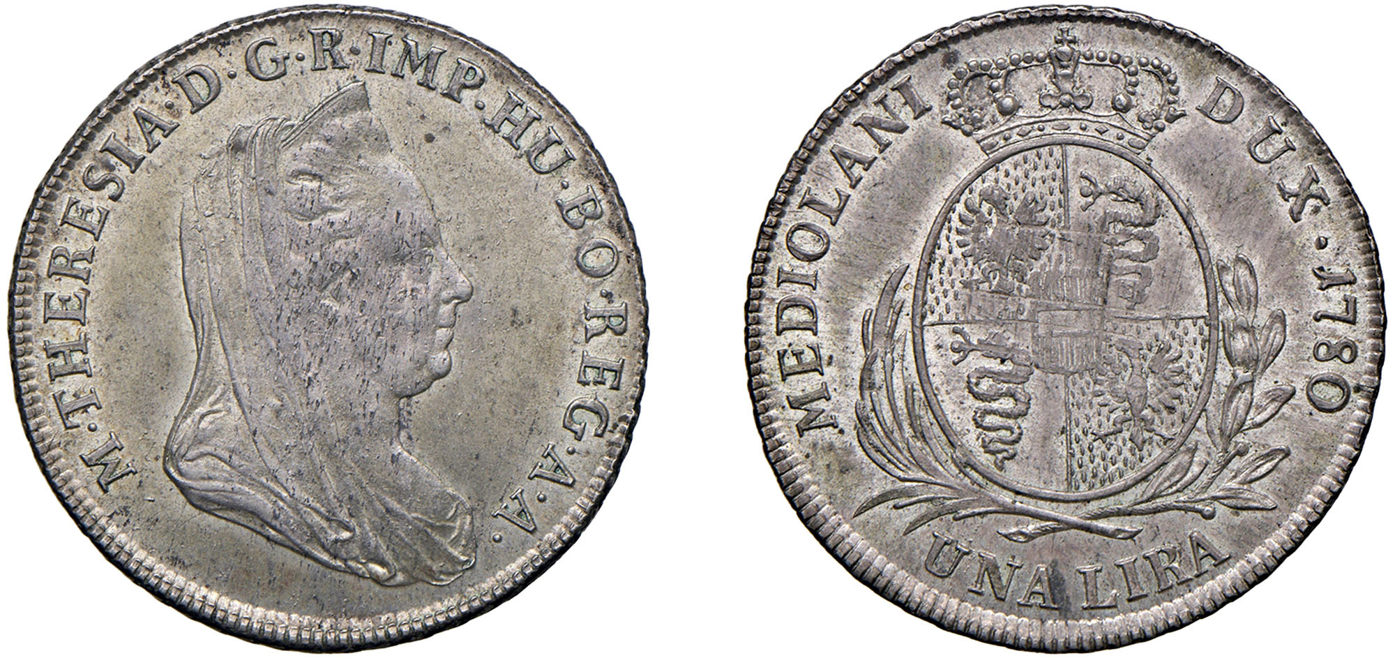 MARIA TERESA D'ASBURGO, Nuova monetazione (1778-1780) - Lira 1780, Milano.Argento, 6,25 gr.Dritto: Busto a destra velato e diademato; - Rovescio: Scudo ovale sormontato da corona imperiale e inquartato con l'aquila e la biscia. Al centro, scudo d'Austria; ai lati rami di palma e d'alloro.Crippa 40/C Molto raraLievi screpolature di conio al D/, ma esemplare di eccezionale qualità per il tipo di moneta.SPL/FDC