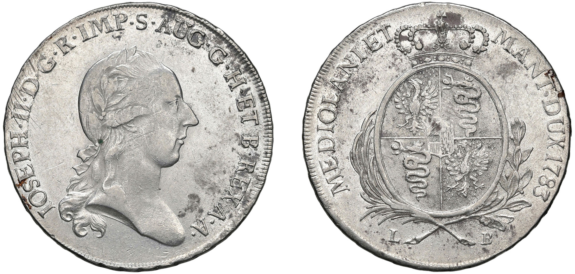 GIUSEPPE II D'ASBURGO-LORENA, monetazione di tipo lombardo (1780-1790) - Scudo 1783, Milano.Argento, 23,13 gr.Dritto: Testa a destra laureata; - Rovescio: Stemma ovale coronato, inquartato con l'aquila e la biscia e caricato dello scudo d'Austria e Lorena. Ai lati, rami di palma e di lauro.Crippa 3/C RaroLievissimi graffietti ma gradevole esemplare.q.SPL