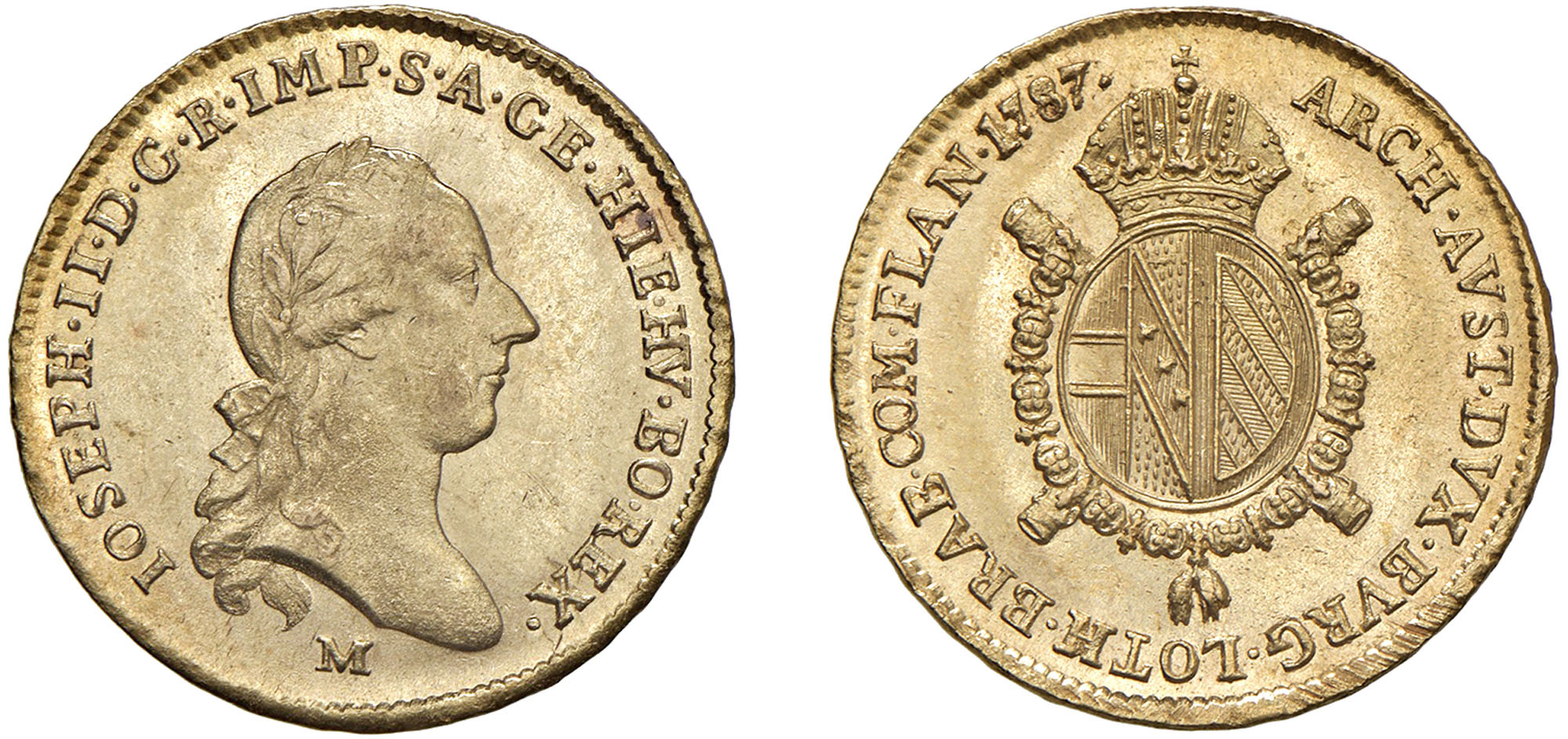 GIUSEPPE II D'ASBURGO-LORENA, monetazione imperiale (1780-1790) - Mezzo sovrano, 1787, Milano.Oro, 5,57 gr.Dritto: Testa a destra laureata; - Rovescio: Stemma ovale d'Austria coronato e sovrapposto a Croce di Borgogna; intorno Collare del Toson d'oro.Crippa 15/ABellissimo esemplare.q.FDC