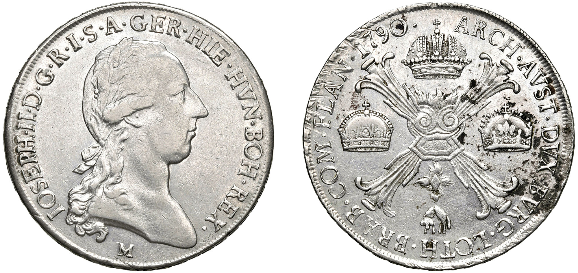 GIUSEPPE II D'ASBURGO-LORENA, monetazione imperiale (1780-1790) - Crocione 1790, Milano.Argento, 29,47 gr.Dritto: Testa a destra laureata; - Rovescio: Croce di Borgogna accantonata dalle corone d'Austria, Ungheria e Boemia, da cui pende il Toson d'oro.Crippa 17/E RaroHairlines di pulizia. Lievi ossidazioni al /R.BB