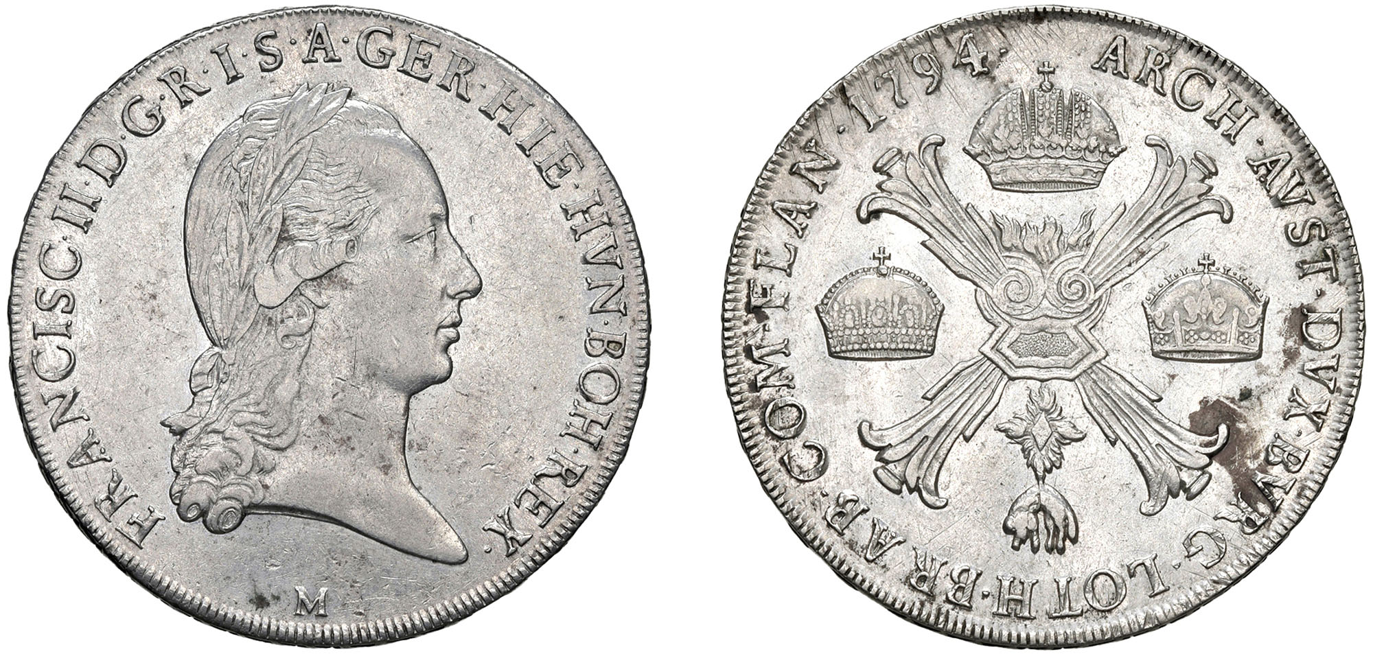 FRANCESCO II D'ASBURGO-LORENA, Imperatore e Duca di Milano (1792-1796) - Crocione 1794, Milano.Argento, 29,48 gr.Dritto: Testa a destra laureata; - Rovescio: Croce di Borgogna accantonata dalle corone d'Austria, Ungheria e Boemia, da cui pende il Toson d'oro.Crippa 7/CImpercettibili graffietti.m.BB/q.SPL