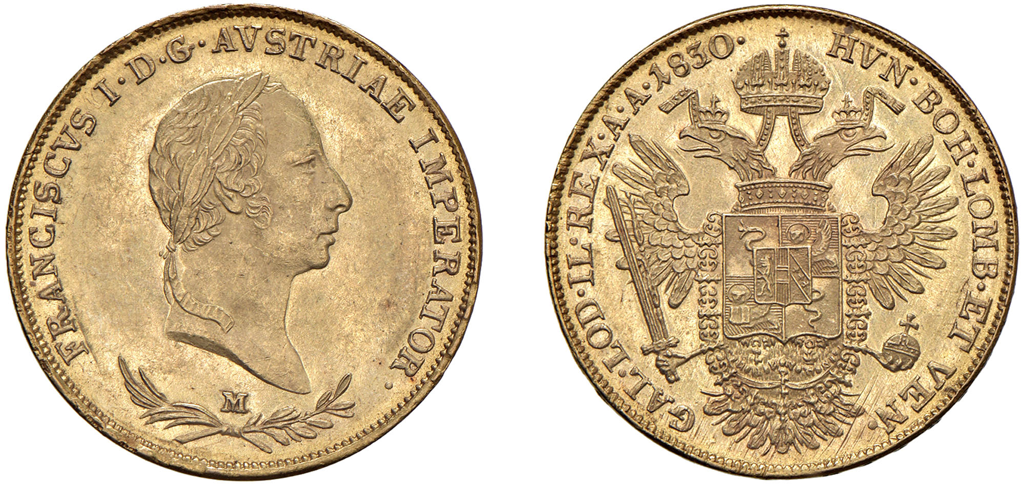 FRANCESCO I D'ASBURGO-LORENA (1815-1835) - Sovrana 1830, Milano.Oro, 11,36 gr.Dritto: Testa a destra laureata; - Rovescio: Aquila bicipite coronata e caricata dello stemma inquartato del Regno Lombardo-Veneto. Lo stemma è sormontato dalla Corona ferrea e circondato dal Collare del Toson d'oro.Crippa 1/I Molto raraBellissimo esemplare.q.FDC