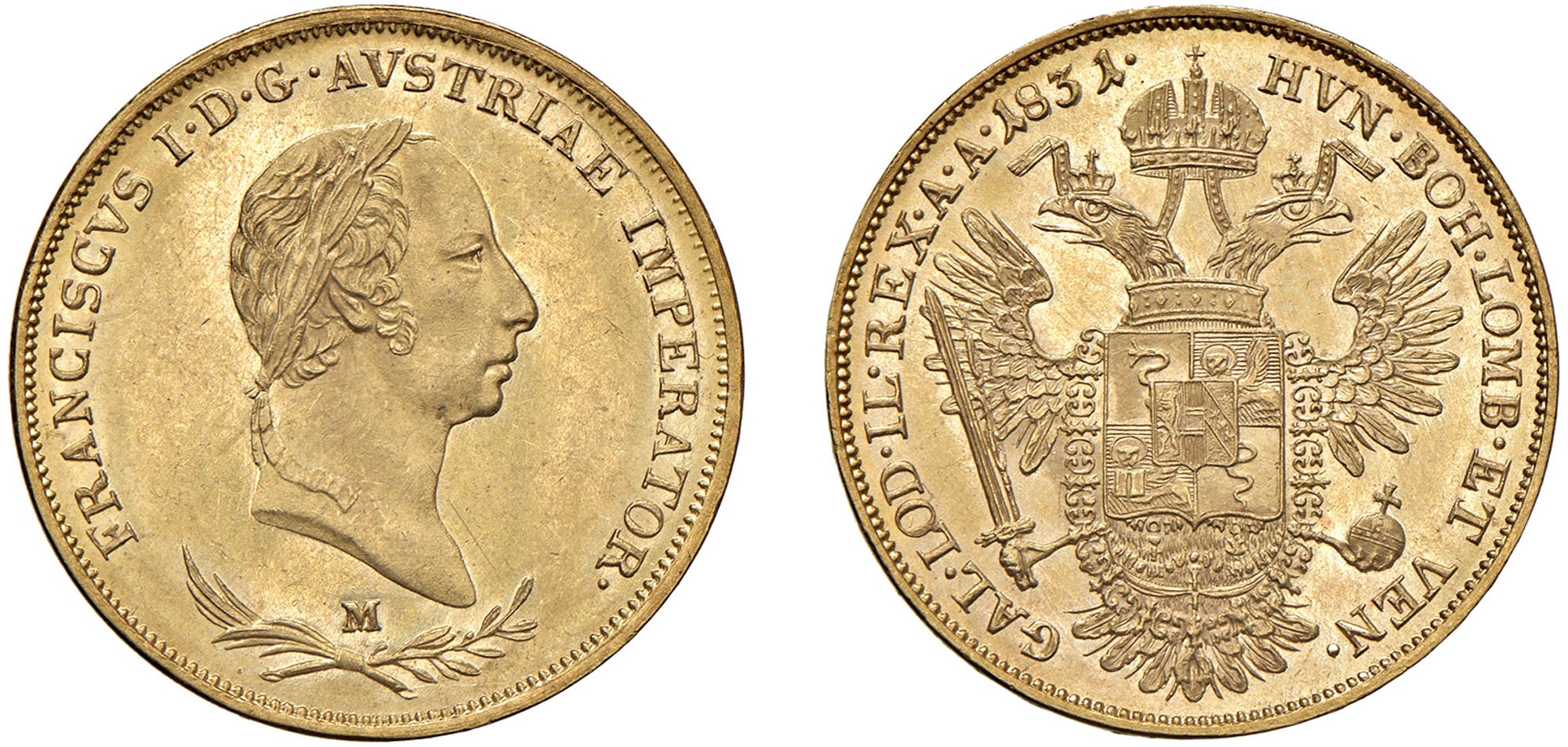 FRANCESCO I D'ASBURGO-LORENA (1815-1835) - Sovrana 1831, Milano.Oro, 11,35 gr.Dritto: Testa a destra laureata; - Rovescio: Aquila bicipite coronata e caricata dello stemma inquartato del Regno Lombardo-Veneto. Lo stemma è sormontato dalla Corona ferrea e circondato dal Collare del Toson d'oro.Crippa 1/LBellissimo esemplare.q.FDC