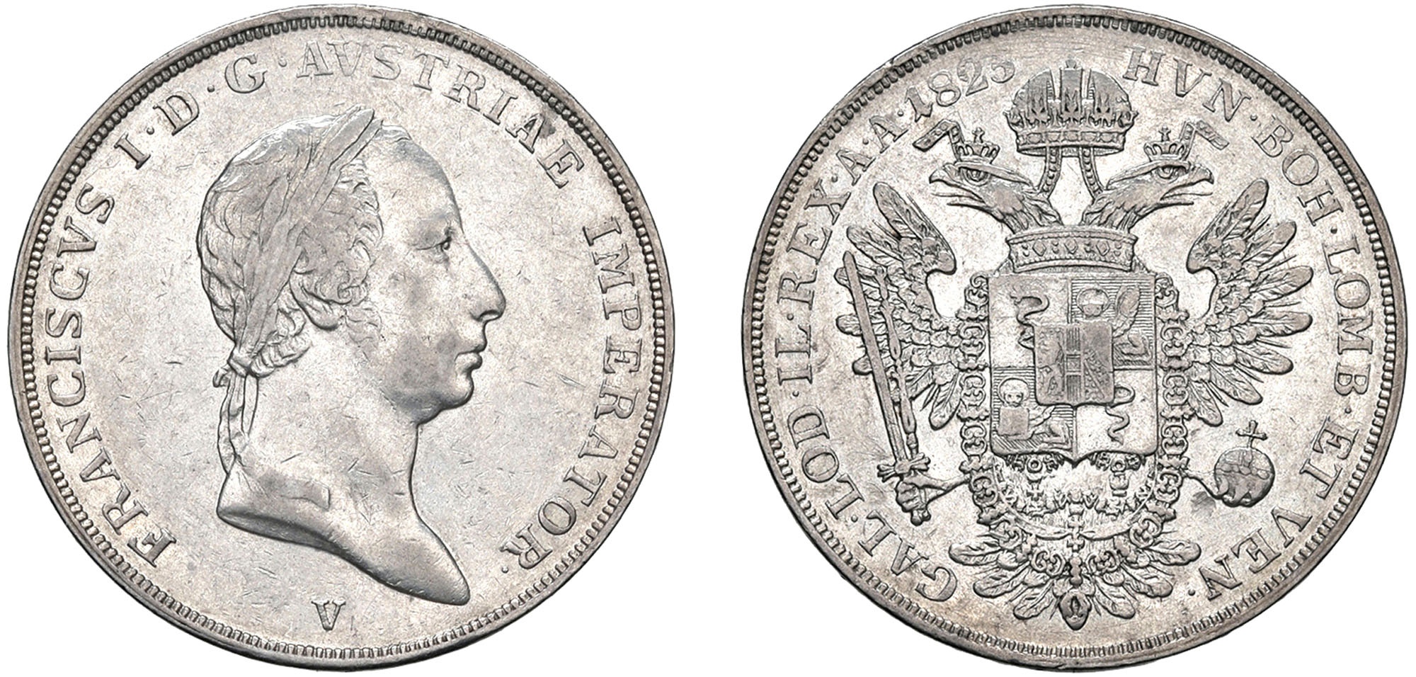 FRANCESCO I D'ASBURGO-LORENA (1815-1835) - Mezzo scudo nuovo 1825, Venezia.Argento, 12,99 gr.Dritto: Testa a destra laureata; - Rovescio: Aquila bicipite coronata e caricata dello stemma inquartato del Regno Lombardo-Veneto. Lo stemma è sormontato dalla Corona ferrea e circondato dal Collare del Toson d'oro.Gigante 61 Non comune.BB