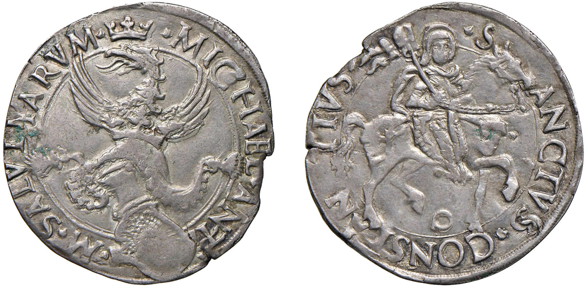 CARMAGNOLA - MICHELE ANTONIO DI SALUZZO (1504-1528) - Cornuto, s.d..Argento, 4,81 gr. - Diam. 29 mm.Dritto: Scudo sormontato da elmo ornato con cimiero ad aquila coronata ad ali spiegate. - Rovescio: San Costanzo a cavallo verso destra, con stendardo.MIR 146 Raroq.SPL