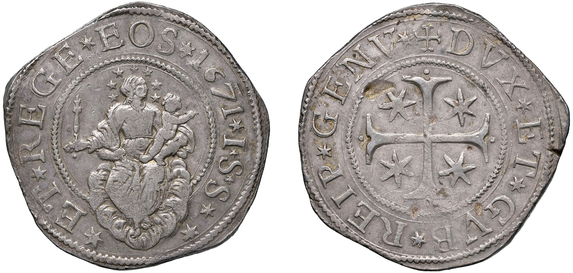 GENOVA - DOGI BIENNALI (III Fase, 1637-1797) - Scudo 1671, AB.Argento, 38,22 gr.Dritto: la Vergine con il Bambino coronata di stelle e seduta sulle nubi - Rovescio: croce accantonata da quattro stelle.MIR 294/31Carenze di tondello al /R, ma bell'esemplare con patina riposata.BB/q.SPL