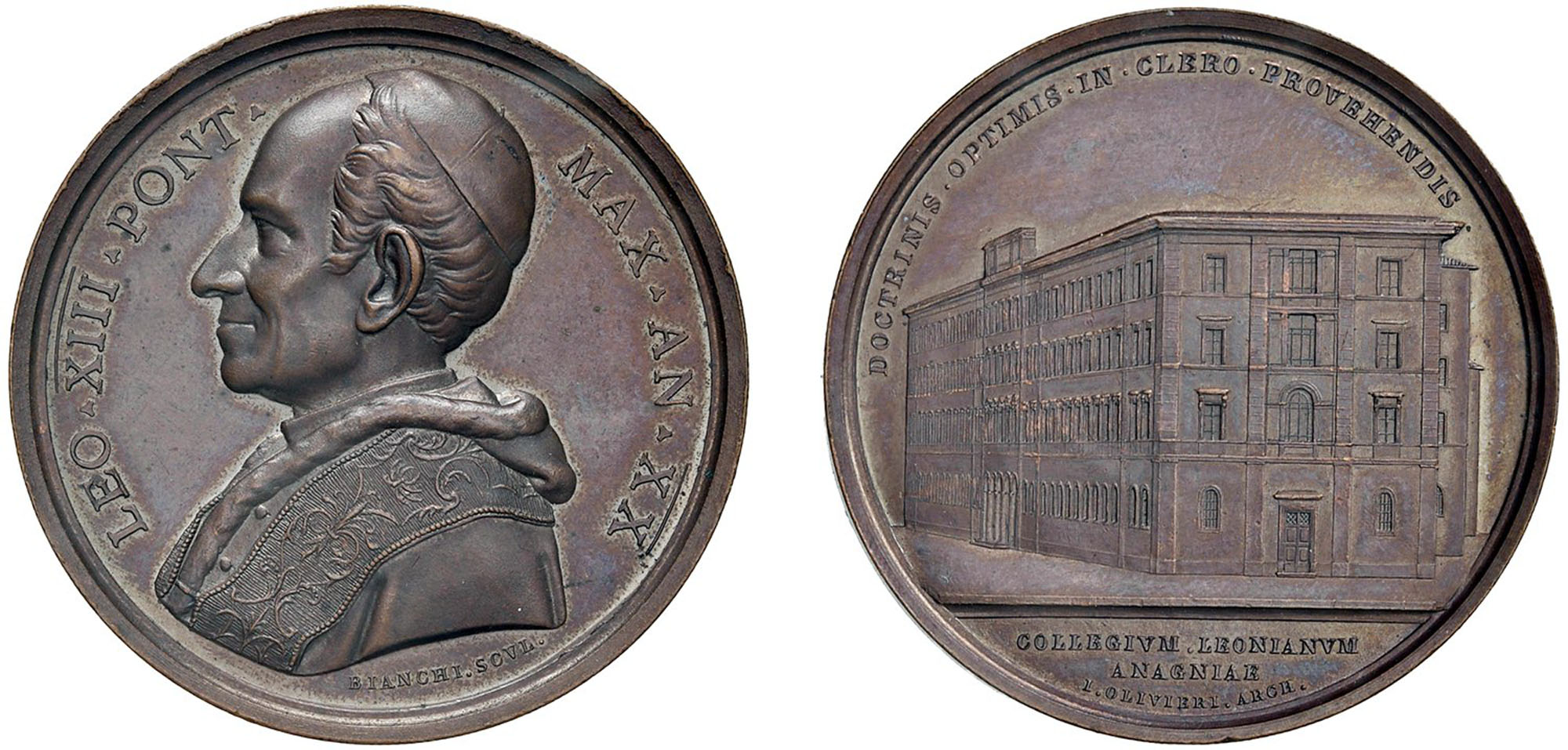 LEONE XIII, Vincenzo Gioacchino Raffaele Luigi Pecci (1878-1903) - Fondazione collegio leoniano, an. XX, Roma.Bronzo, 40.01 gr. - Diam. 43,7 mmDritto: busto a sinistra con berretto, mozzetta e stola; - Rovescio: Vista prospettica del nuovo Collegio di Anagni.Opus. Francesco Bianchi Bartolotti E.897 Rara.q.FDC