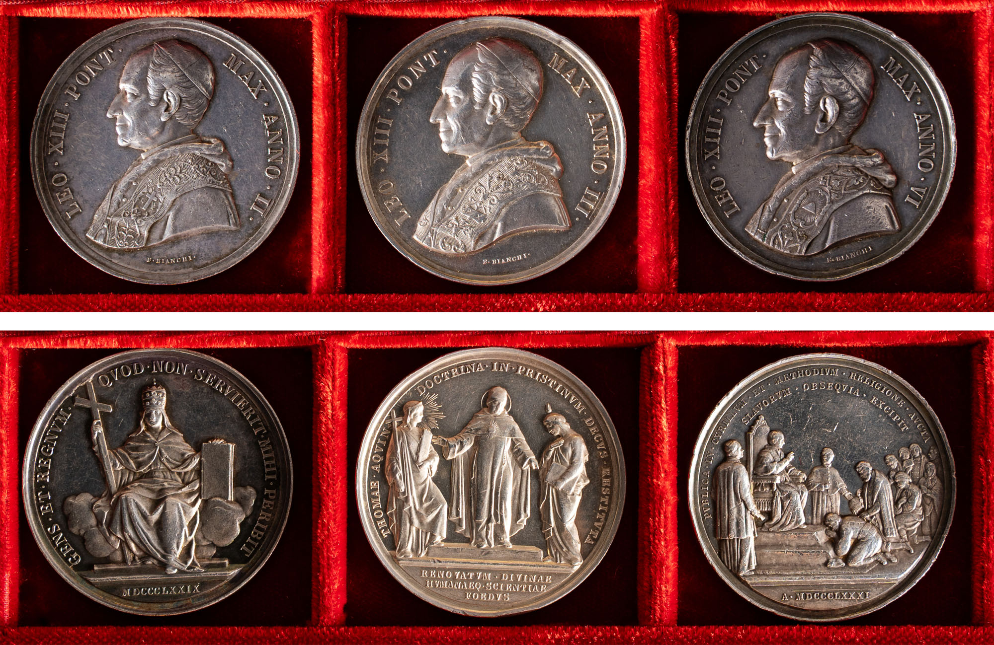 LEONE XIII, Vincenzo Gioacchino Raffaele Luigi Pecci (1878-1903) - Lotto 3 medaglie annuali in argento (an. II, III, VI).Argento, 104,63 gr. - Diam. 43,00 mm.Opus Francesco Bianchi.Bartolotti E.879 (Rara), E. 880 (Rara), E. 883 (Non comune).Colpetti e graffietti.Varie conservazioni, da q.BB a q.SPL