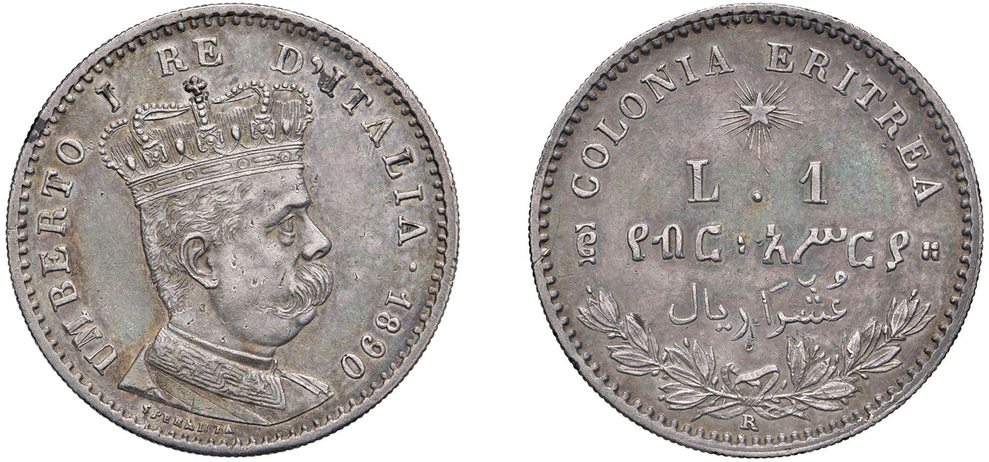 UMBERTO I, Colonia Eritrea (1890-1896) - 1 lira 1890, Roma.Argento, 4,99 gr.Dritto: Semibusto coronato in uniforme a destra; - Rovescio: Stella raggiante ed iscrizione sopra due rami di lauro legati con fiocco.Gigante 5 Non comuneDiffusi segnetti al D/.BB/q.SPL