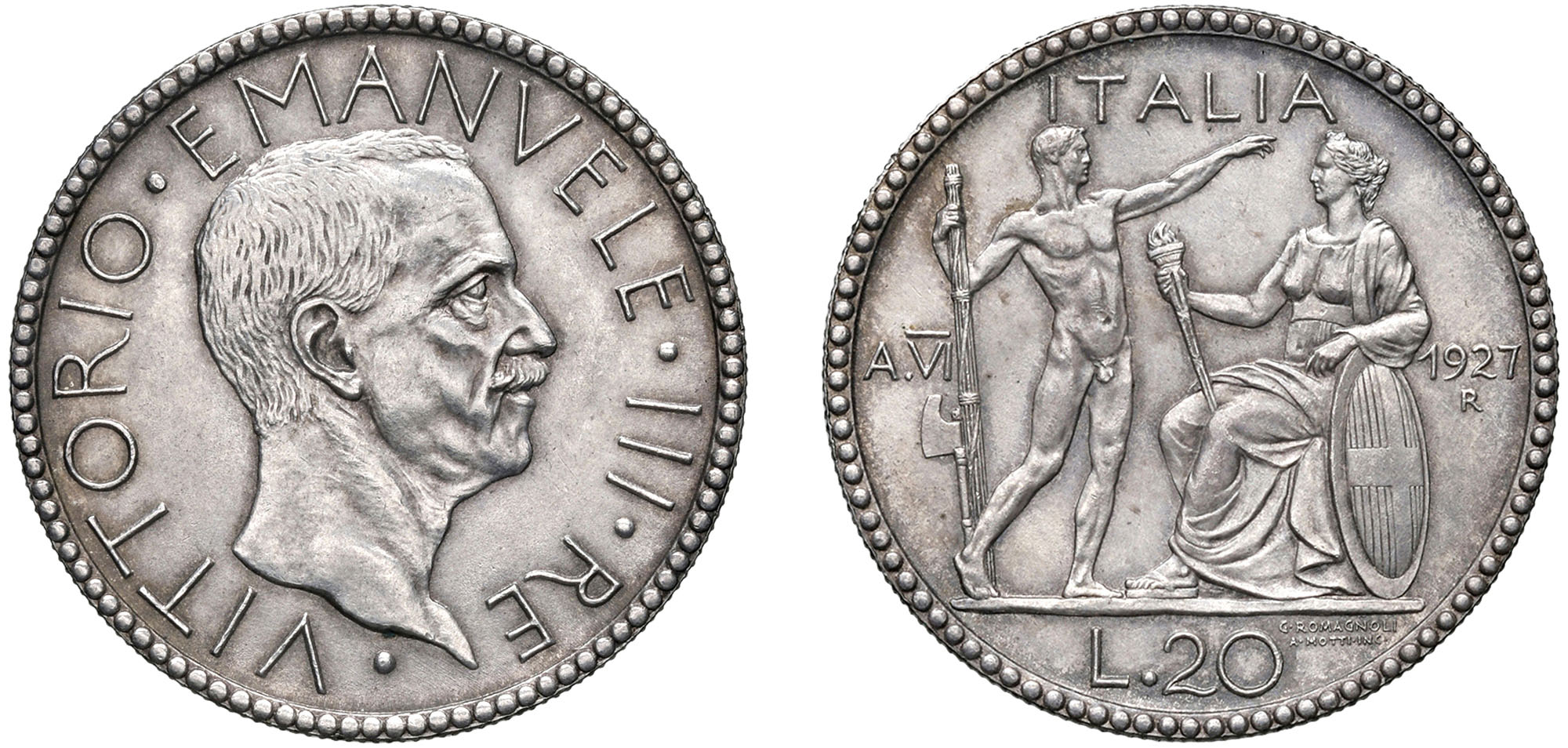 VITTORIO EMANUELE III (1900-1943) - 20 lire 1927, an. VI, Roma.Argento, 15,00 gr.Dritto: Testa nuda a destra; - Rovescio: Giovane, con fascio littorio, saluta romanamente la Grande Madre Italia assisa, appoggiata su uno scudo sabaudo e tenente una fiaccola.Gigante 36Esemplare con patina riposata.SPL-FDC