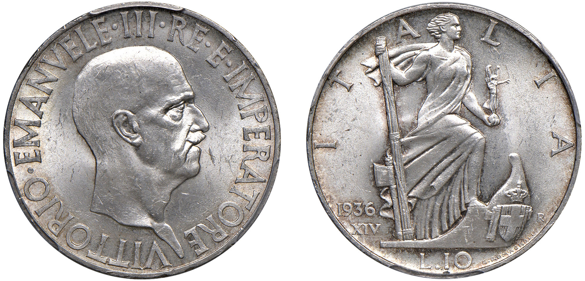 VITTORIO EMANUELE III (1900-1943) - 10 lire 1936, Roma.Argento, n.d.Dritto: Testa nuda a destra; - Rovescio: L'Italia a destra, con fascio littorio e 'Vittoriola' su nave fregiata da stemma sabaudo crociato e coronato.Gigante 64 Sigillato PCGS MS64.Esemplare dal lustro integro ed intenso.Certificato PCGS n. 56918690.