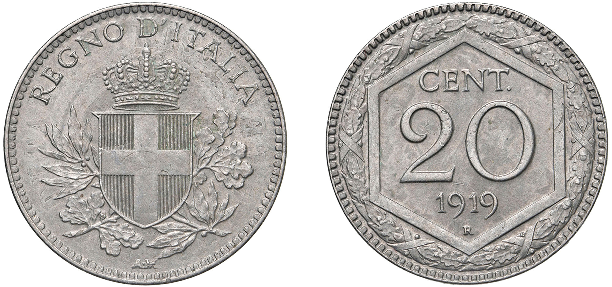 Lotto 216 | VITTORIO EMANUELE III (1900-1943) - 20 centesimi 1919, esagono, Roma.