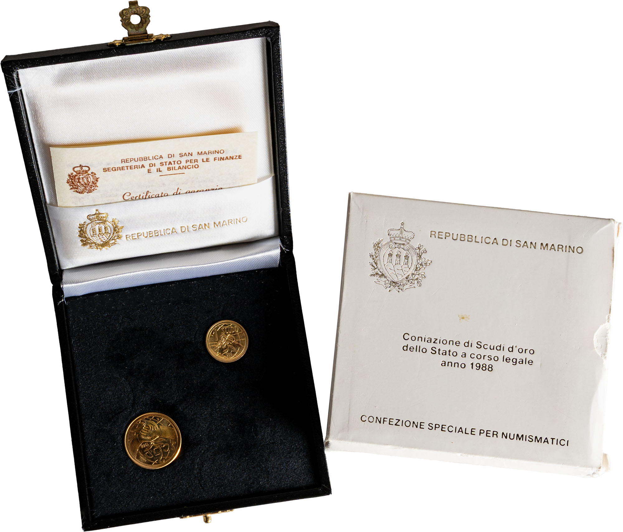 SAN MARINO - Nuova monetazione (1972-) - Dittico da 1 e 2 scudi 1988, 'Il Disarmo'.Oro, 10,00 gr.Gigante 164In cofanetto e confezione originale della zecca.FDC