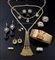 In oro giallo, a maglia, alternata a ovali con quarzi citrini e acquamarine; al centro tre pendenti, due a cuore in diamanti taglio 8/8 e a ottagono con al centro zaffiro taglio ovale circondato da pietre sintetiche