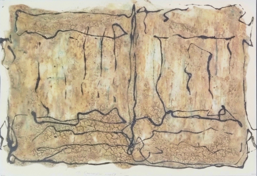 RACCAGNI ANDREA Imola 1921 - 2005 "Senza titolo" Tecnica mista su carta cm 41x28 del 1959. Firmata e datata sul fronte in basso al centro. Autentica su foto con timbri a secco "Edizioni Bora", "Ebland Srl" e "Artantartide". Opera pubblicata a pag. 21 del catalogo "Andrea Raccagni - quando la materia sogna". Catalogo a corredo.