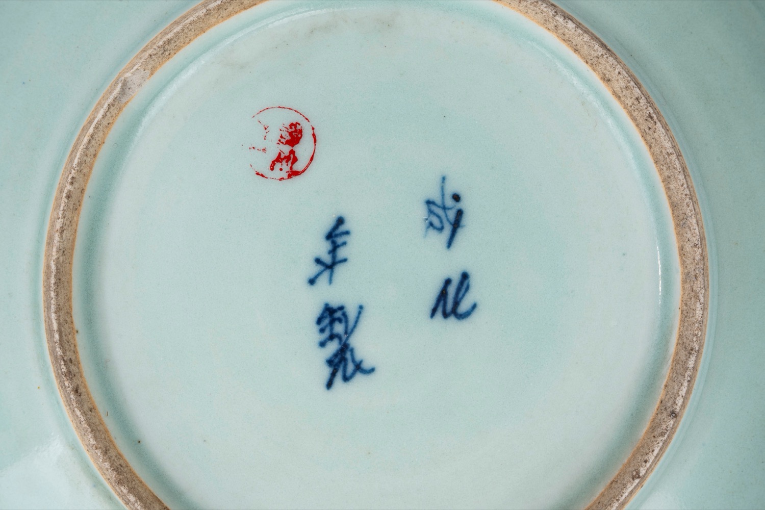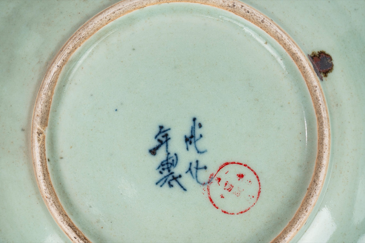 Difetti.decorazione blu con motivo centrale calligrafico circolare e motivi simmetrici a volute e ruyi.