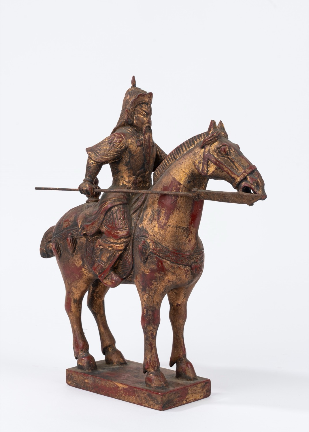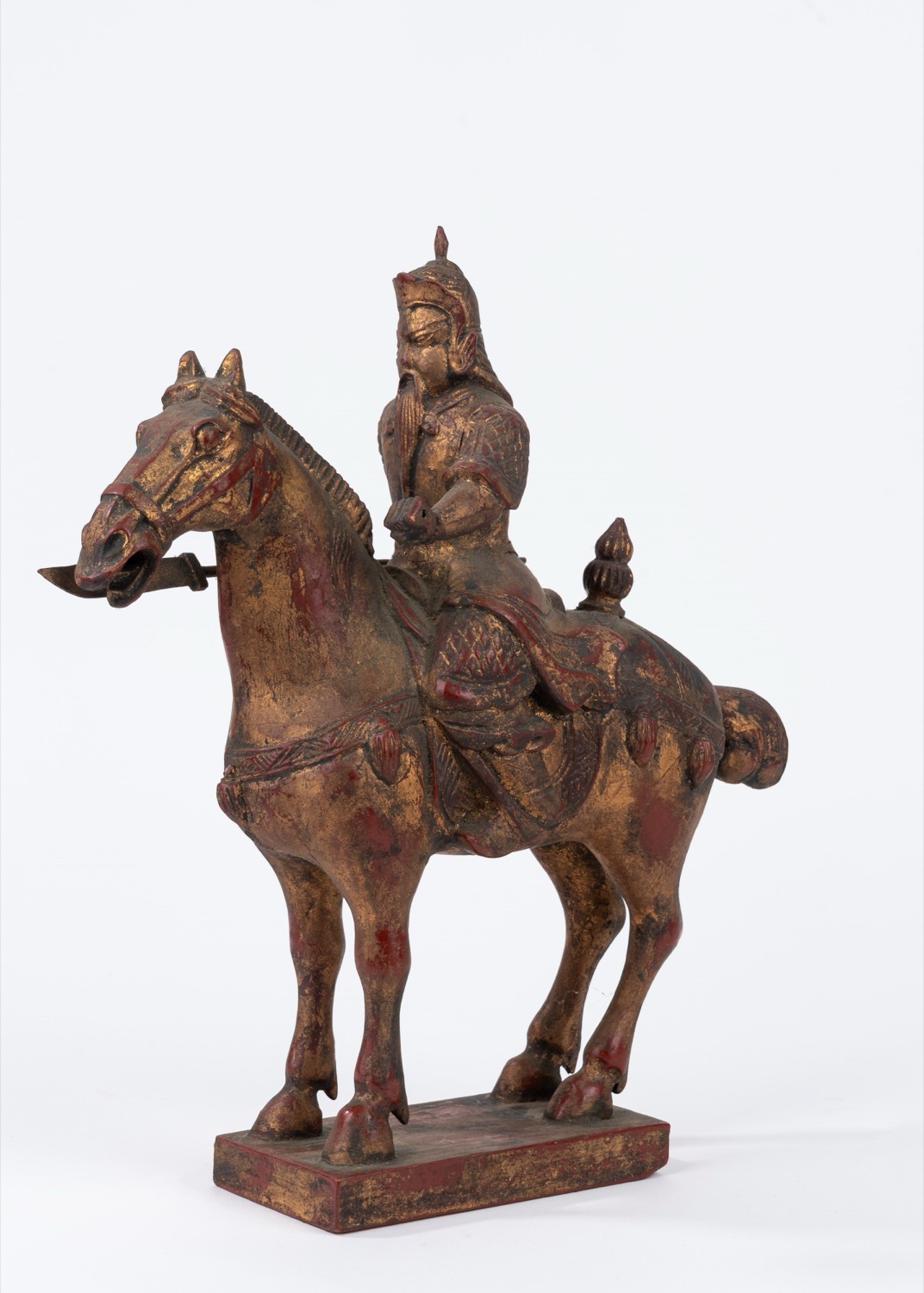 Cavaliere a cavallo in legno laccato e dorato, Cina, secolo XX
