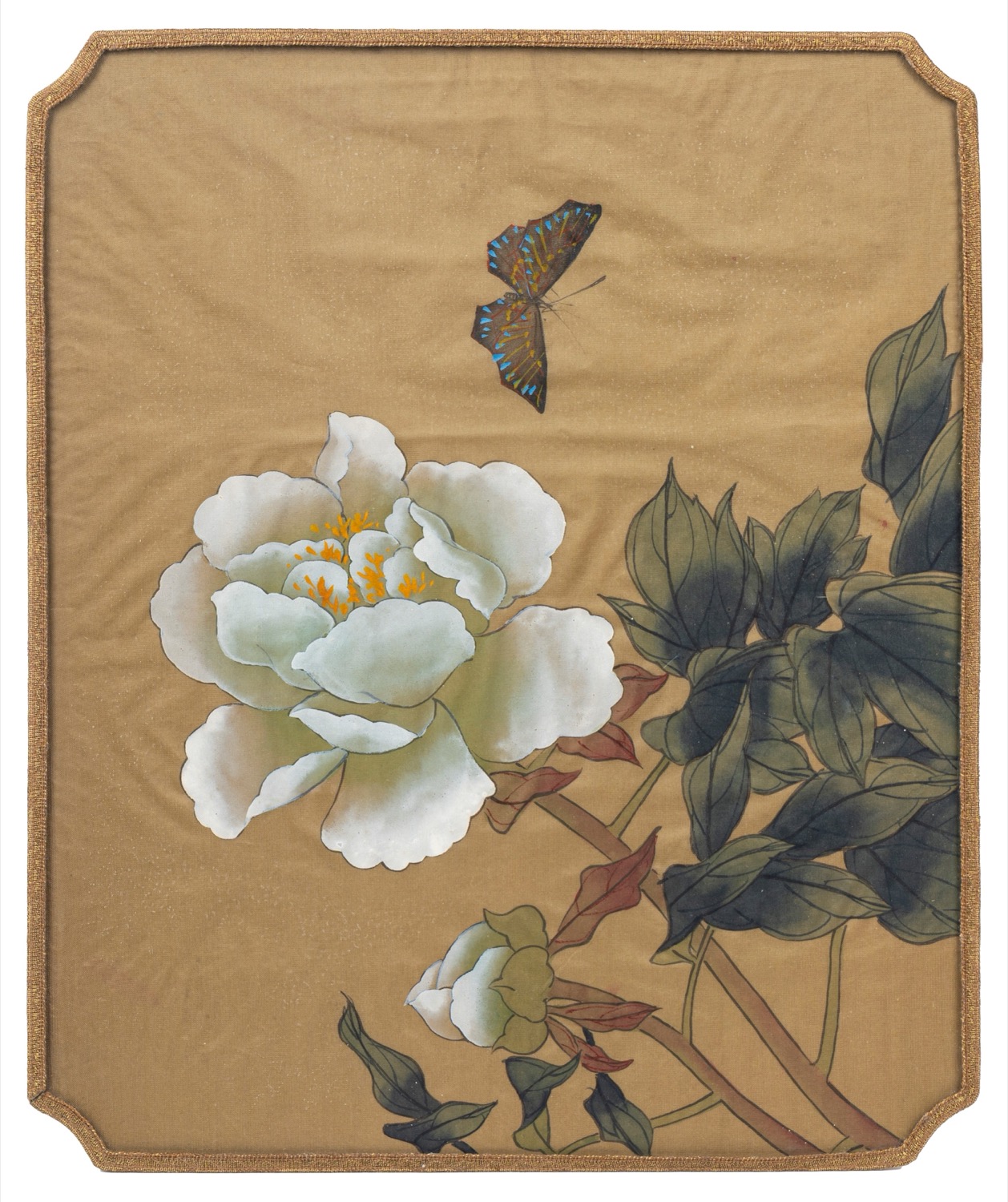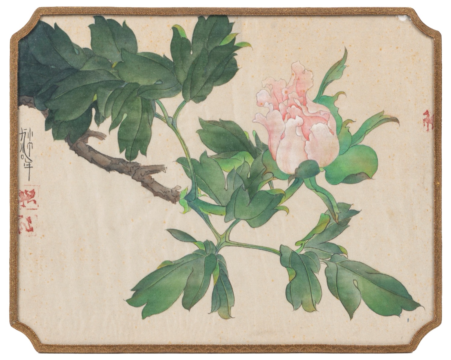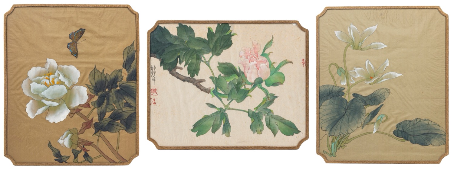 in stile cinese raffiguranti motivi floreali, con kana sillabici e sigilli (in cornice)in stile cinese raffiguranti motivi floreali, con kana sillabici e sigilli (in cornice)