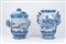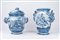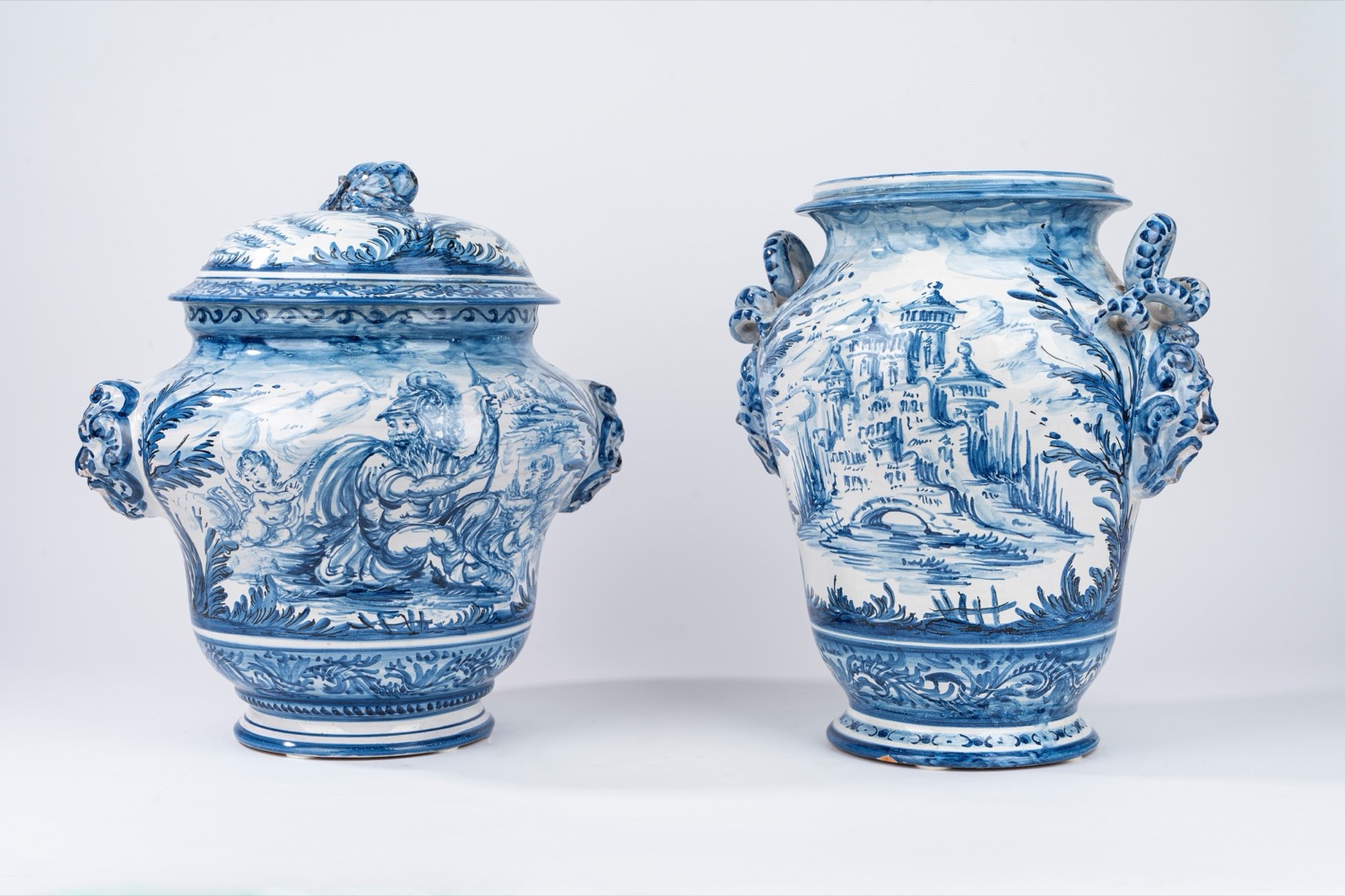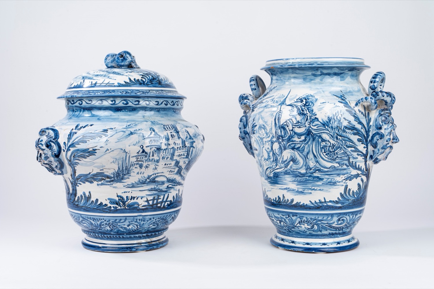 Due grandi vasi istoriati in maiolica bianca e blu, di cui uno con coperchio