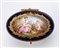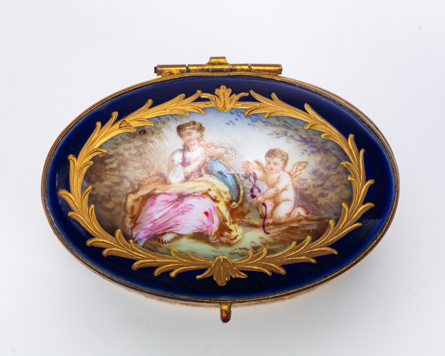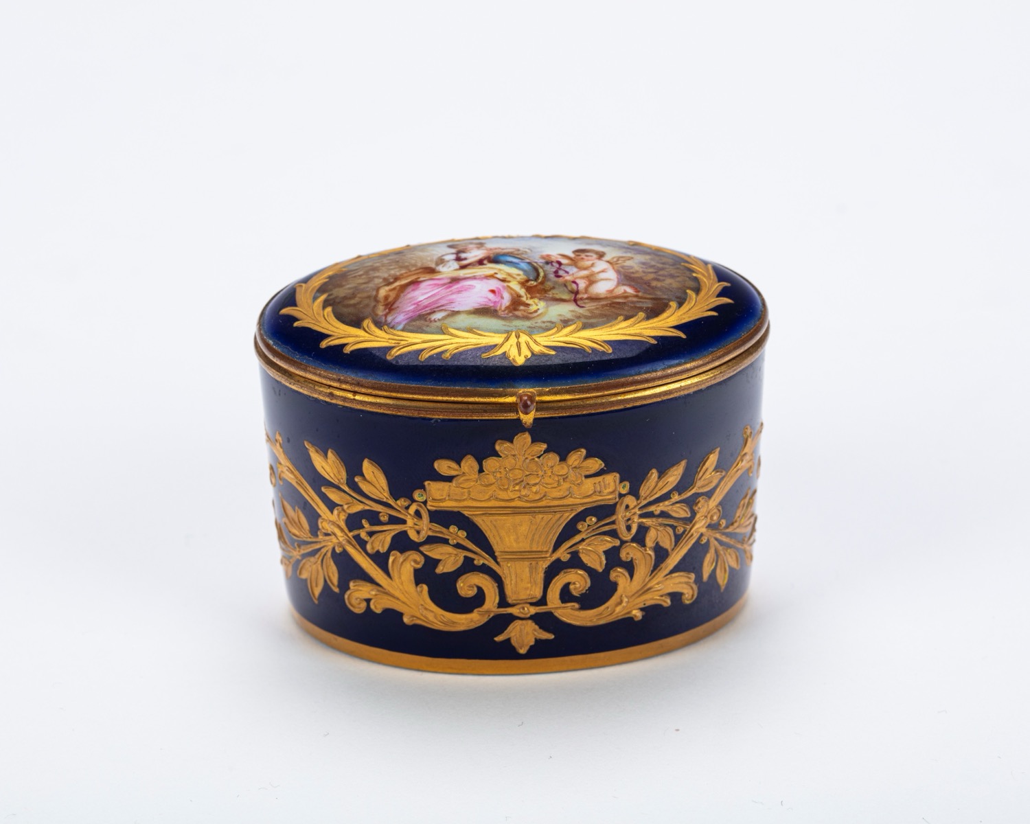 Marchio sotto la base.Di forma ovale in porcellana a fondo blu decorata sul coperchio con riserva policroma raffigurante dama e amorino in un paesaggio. Sulla fascia vaso di fiori tra volute fogliate e motivo a valva di conchiglia in oro e a rilievo.