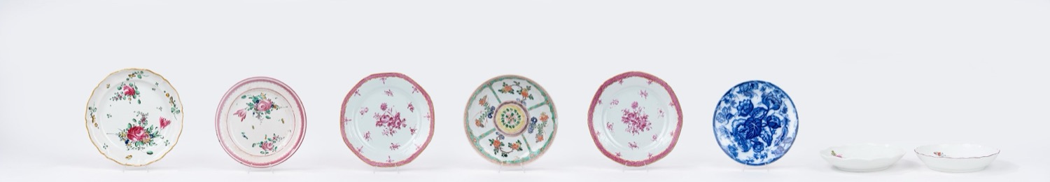 due piatti fondi con bordo polilobato, decorati a motivi floreali, manifattura di Meissen; uno cinese; uno bianco e blu a motivi floreali, manifattura Richard; due decorati con motivi floreali color porpora; due a motivi floreali su fondo bianco