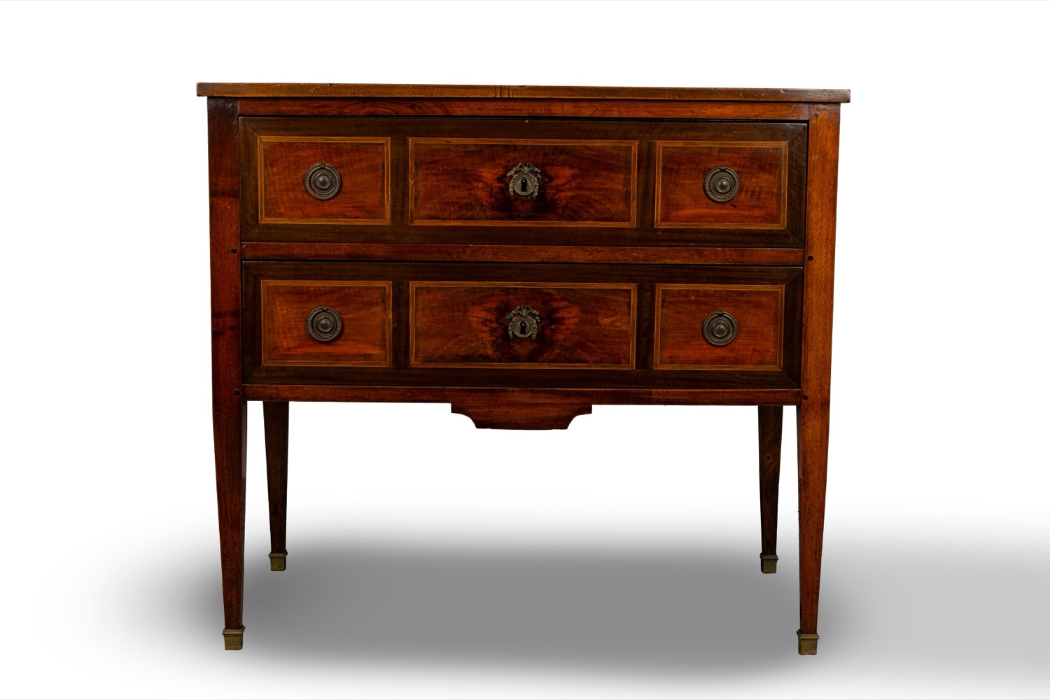 in legno intarsiato con filettature a riserve rettangolari, due cassetti, maniglie, bocchette e scarpette in bronzo