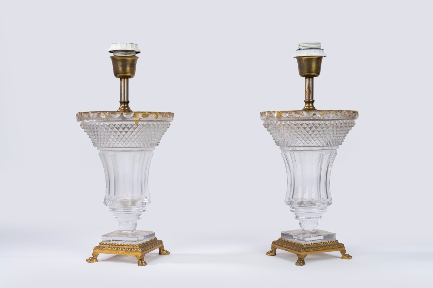 Coppia di lampade da tavolo con basi in cristallo sfaccettato e parzialmente molato