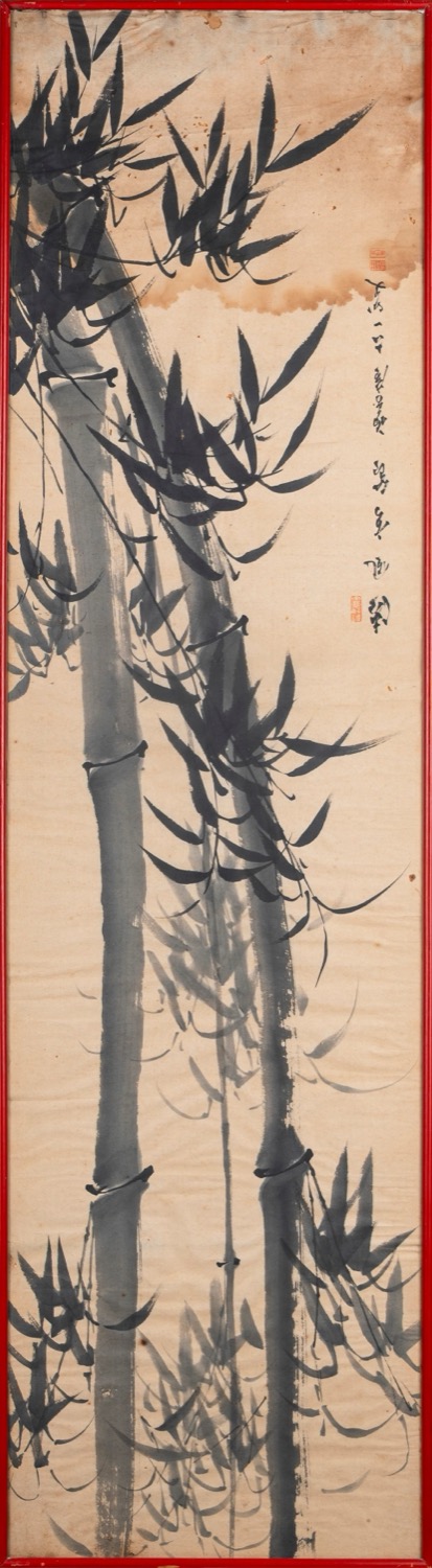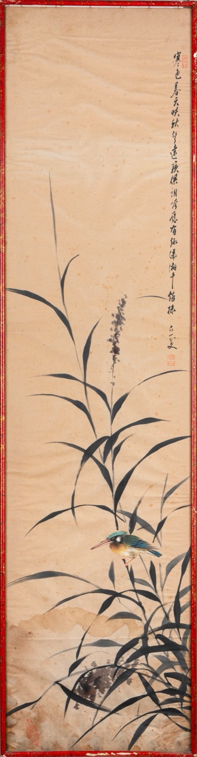 con bambù, orchidea e martin pescatore. Presenti firma, sigillo e data.