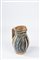 in maiolica dipinta nei toni del blu di cobalto e giallo-arancio antimonio. Corpo piriforme schiacciato verso il piede basso e a disco, collo basso con bocca trilobata, da cui si diparte un’ansa a nastro. Sul fronte medaglione circolare con cornice a scaletta contenente stemma araldico, circondato da fasce decorate da linee parallele; sul collo una fascia di crocette.