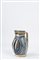 Restauriin maiolica dipinta nei toni del blu di cobalto e giallo-arancio antimonio. Corpo piriforme schiacciato verso il piede basso e a disco, collo basso con bocca trilobata, da cui si diparte un’ansa a nastro. Sul fronte medaglione circolare con cornice a scaletta contenente stemma araldico, circondato da fasce decorate da linee parallele; sul collo una fascia di crocette.