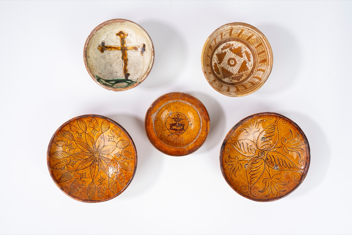in maiolica smaltata e graffita. Una con decoro ferraccia e ramina con croce sul Golgota (manifattura Loretz, Milano, inizio secolo XX?), la coppia con decoro vegetale stilizzato, una con fontana nel cavetto, l'ultima in stile ispano-moresco.