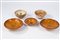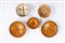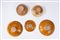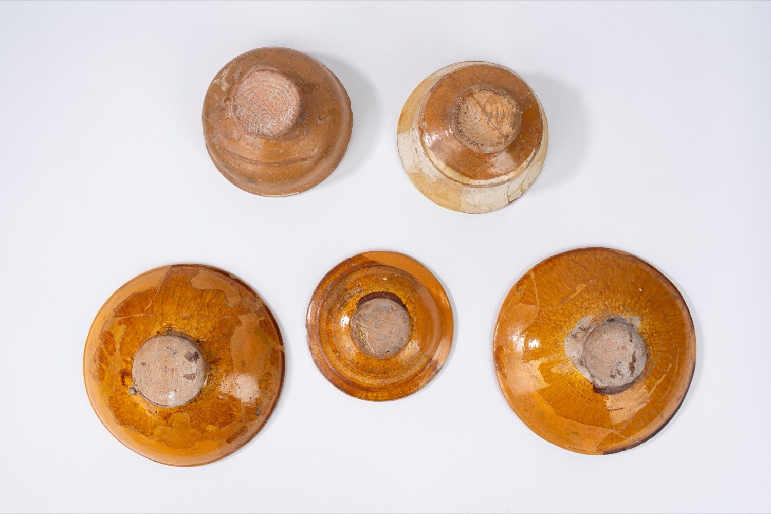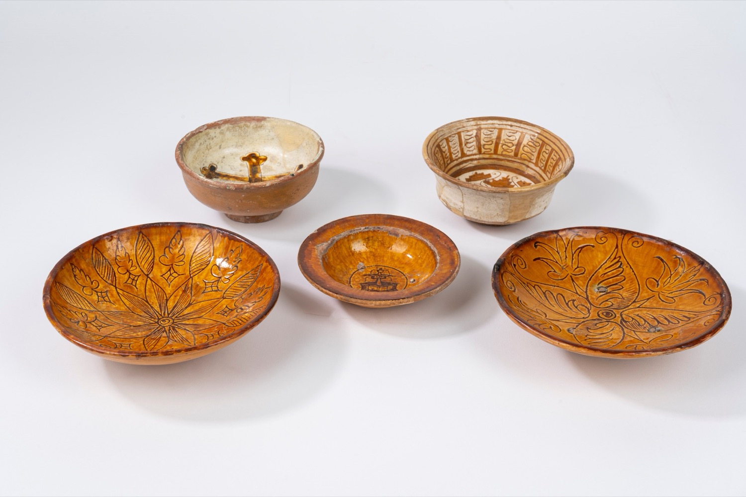 Difetti e restauri in maiolica smaltata e graffita. Una con decoro ferraccia e ramina con croce sul Golgota (manifattura Loretz, Milano, inizio secolo XX?), la coppia con decoro vegetale stilizzato, una con fontana nel cavetto, l'ultima in stile ispano-moresco.
