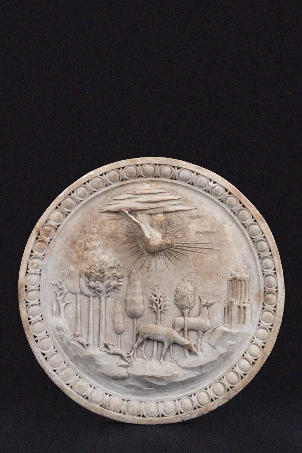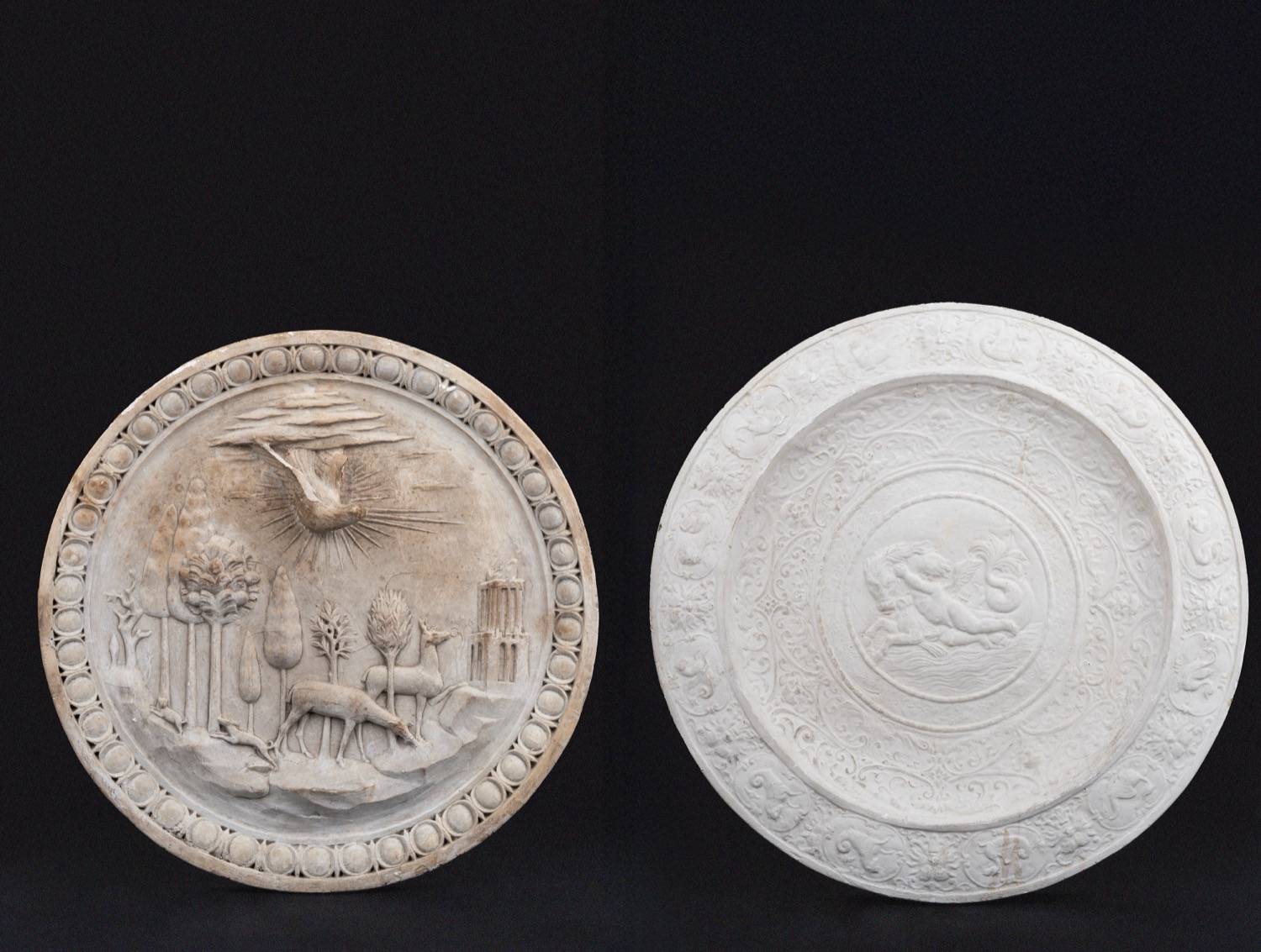 Coppia di tondi a bassorilievo in gesso, uno raffigurante il Paradiso Terrestre, dalla Basilica di S. Maria del Popolo a Roma, l'altro con putto a cavallo di un tritone