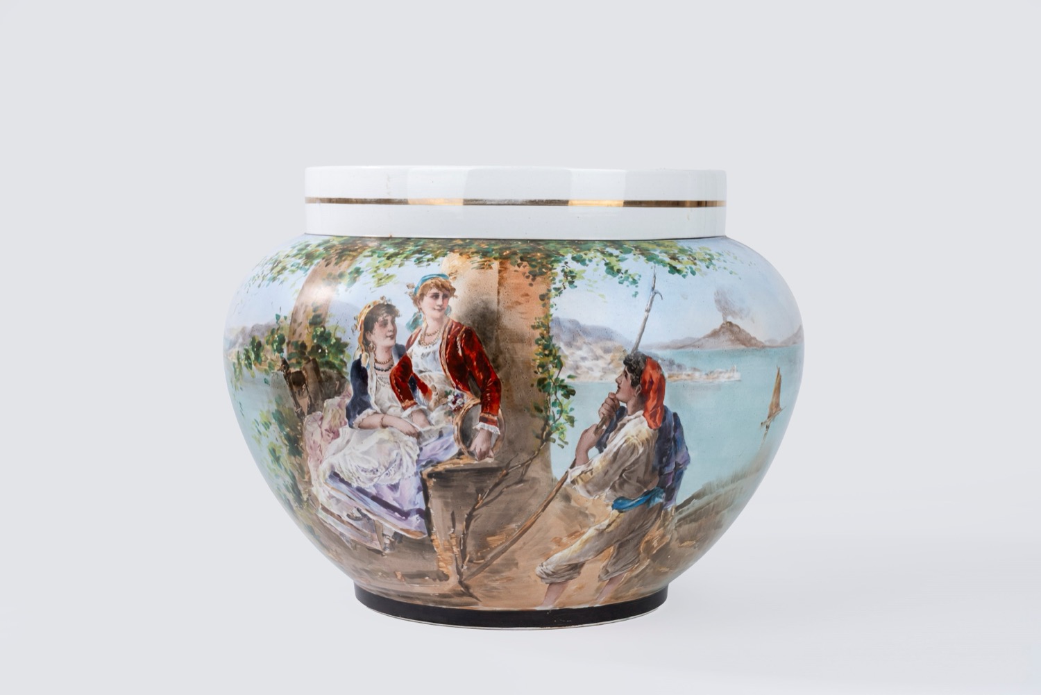 Cache-pot in ceramica policroma con figure in un paesaggio e Vesuvio sullo sfondo, fine secolo XIX - inizi secolo XX