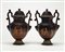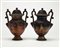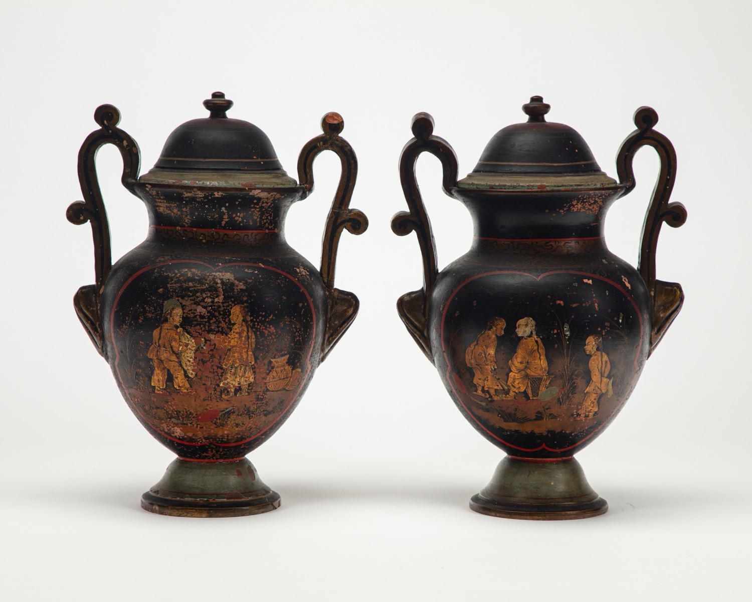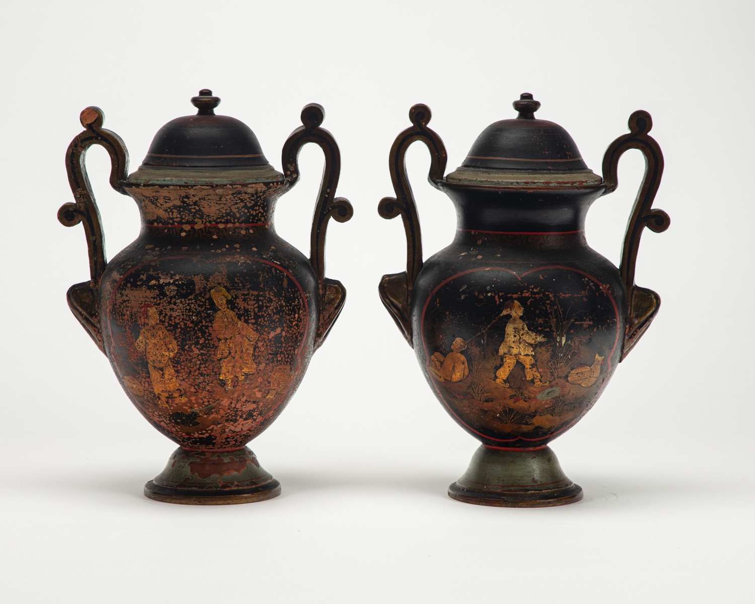 Coppia di vasi biansati con coperchio in terracotta dipinta in policromia su fondo scuro, secolo XVIII-XIX