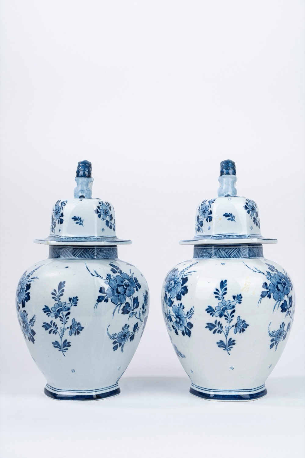 in maiolica bianca e blu, decorati con motivi floreali e paesaggi fluviali entro riserve, con coperchi e presa a forma di leonein maiolica bianca e blu, decorati con motivi floreali e paesaggi fluviali entro riserve, con coperchi e presa a forma di leone
