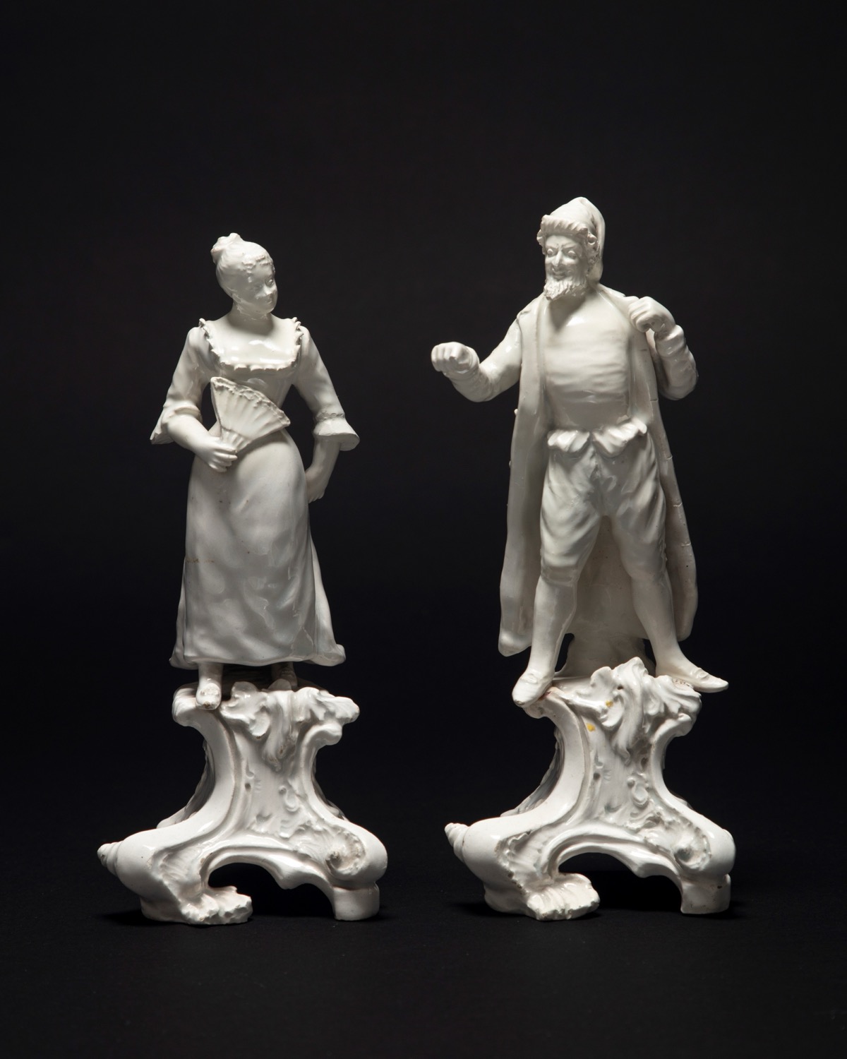 Due figure in terraglia smaltata raffiguranti gentiluomo e gentildonna con ventaglio, manifattura veneta, secolo XVIII
