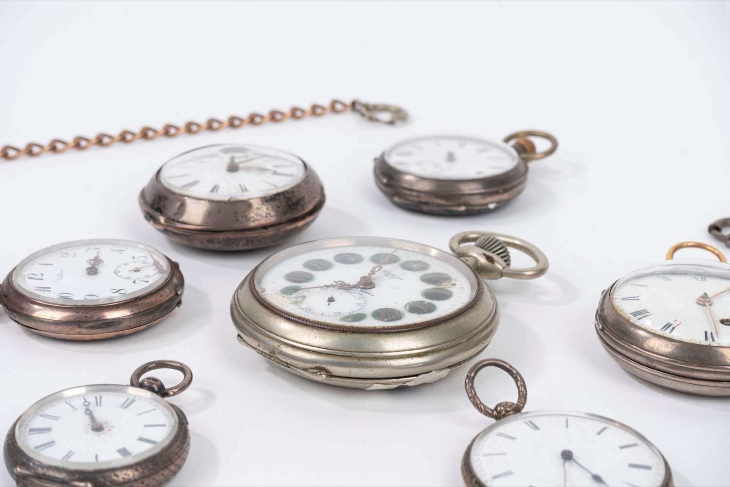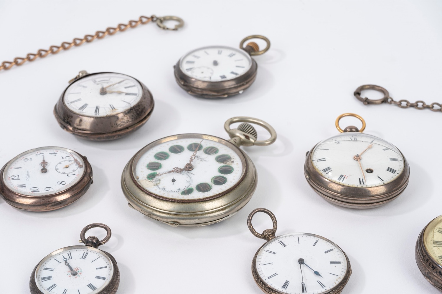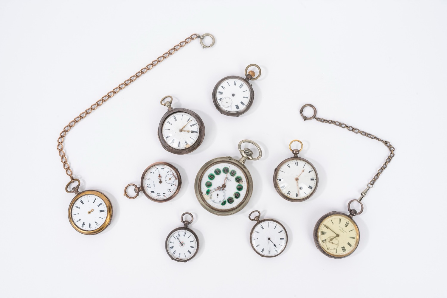 Lotto di 9 orologi da tasca in metalli diversi, fine secolo XIX - inizi secolo XX