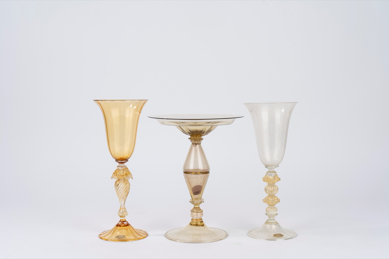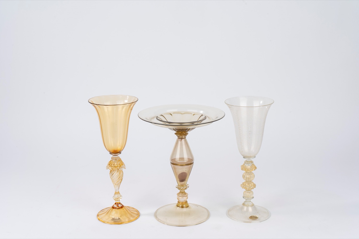 Lotto composto da tre bicchieri in vetro di Murano, uno firmato Seguso