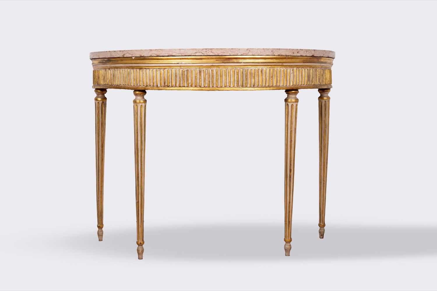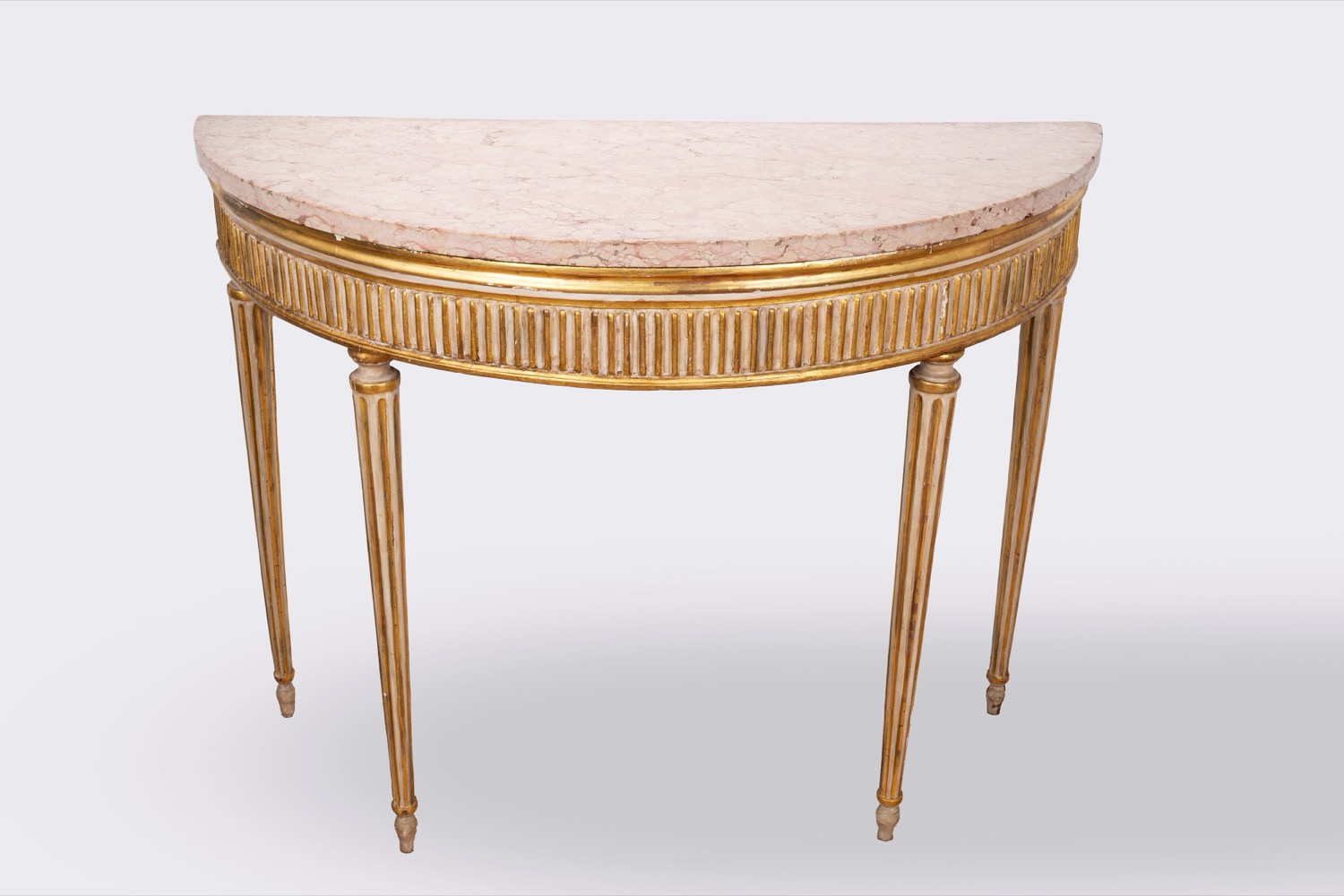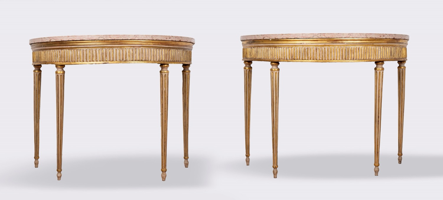 Coppia di consolle a demi lune in legno laccato e dorato, Napoli, Luigi XVI