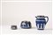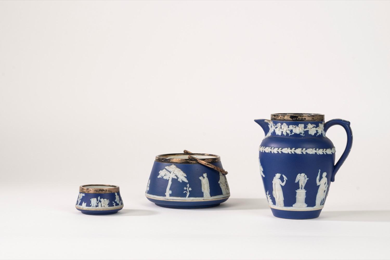 una lattiera, una salierina e una zuccheriera con figure classiche bianche a rilievo su fondo azzurro