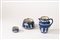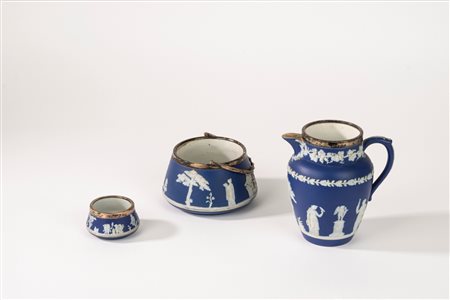 ghiere in argento con punzone di Birmingham 1903una lattiera, una salierina e una zuccheriera con figure classiche bianche a rilievo su fondo azzurro