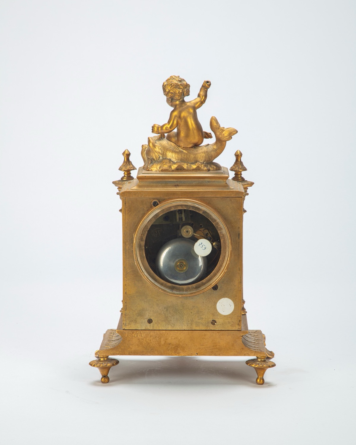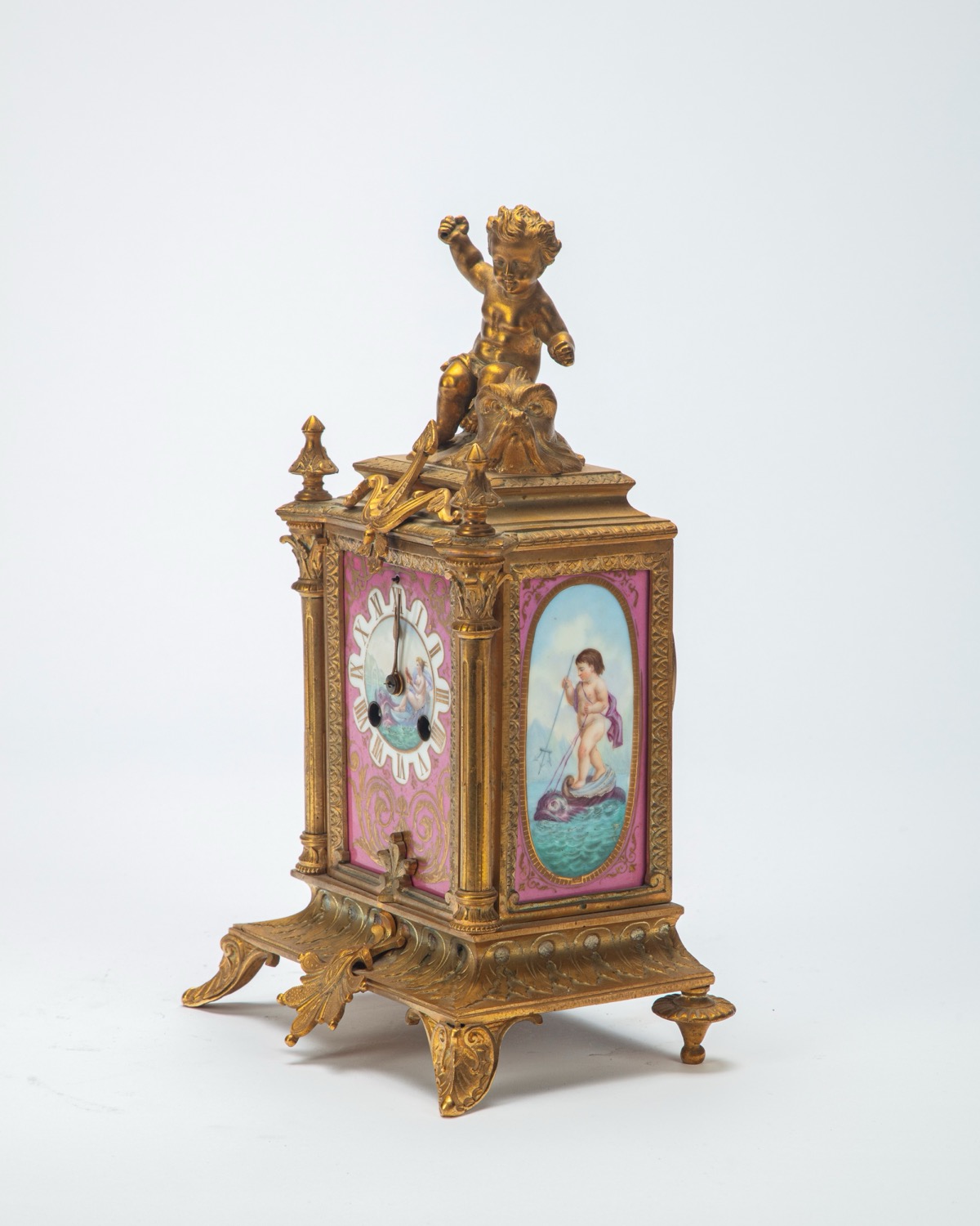 piedi frontali a volute fogliate, posteriori a trottola, montanti a colonna sormontate da putto su delfino, placche in porcellana a fondo rosa decorate con riserve a soggetti marini, quadrante a numeri romani con movimento a due treni e suoneria su campanellopiedi frontali a volute fogliate, posteriori a trottola, montanti a colonna sormontate da putto su delfino, placche in porcellana a fondo rosa decorate con riserve a soggetti marini, quadrante a numeri romani con movimento a due treni e suoneria su campanello