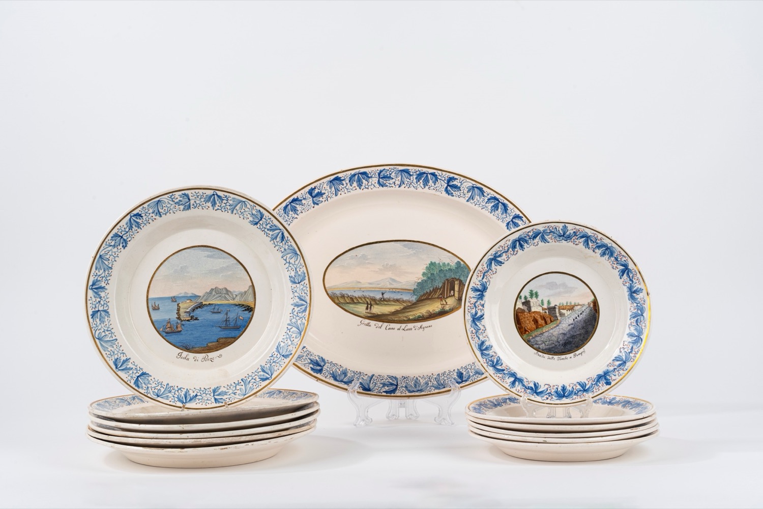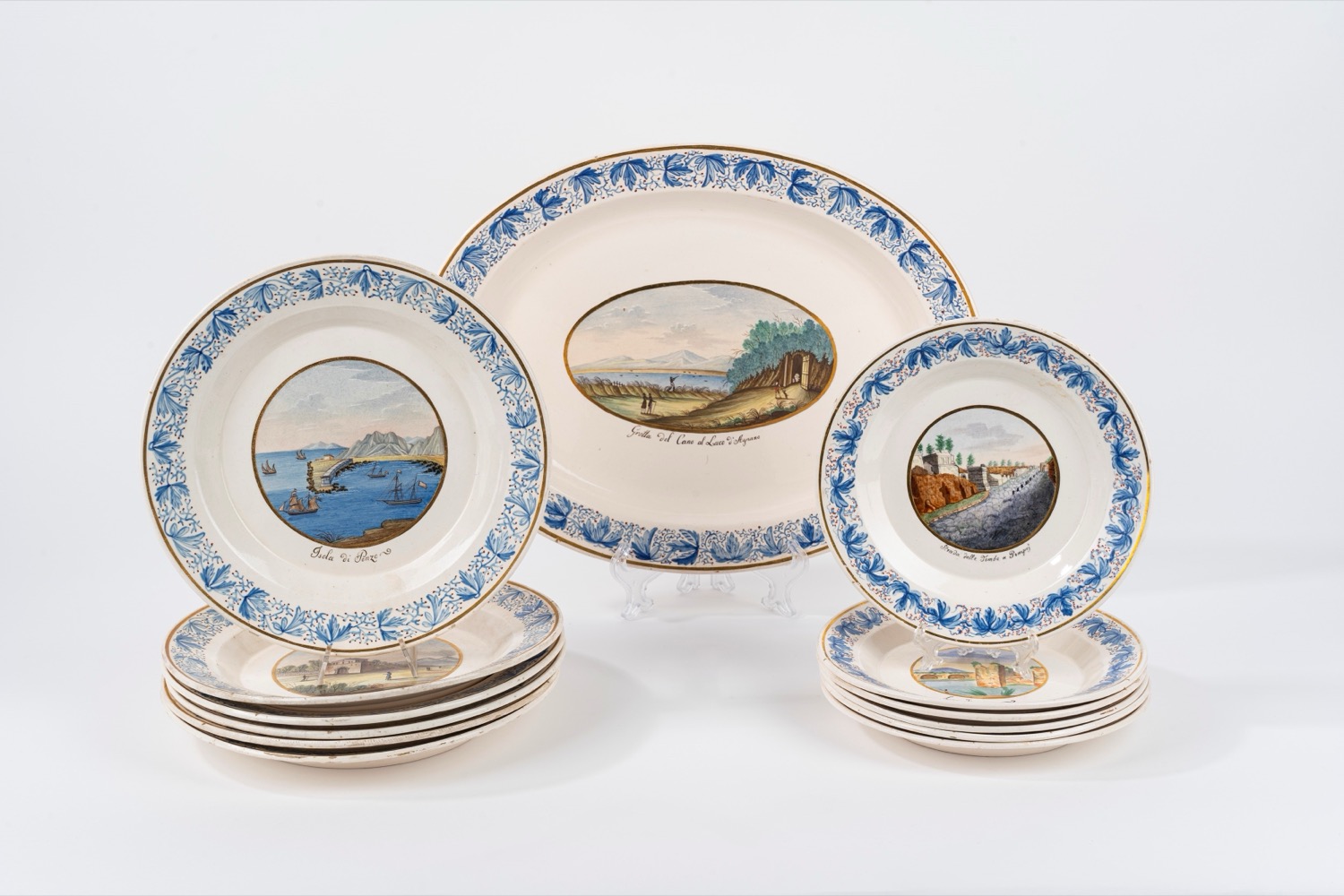 Servizio in terraglia policroma con vedute di città e paesaggi, manifattura Colonnese, Napoli secolo XIX