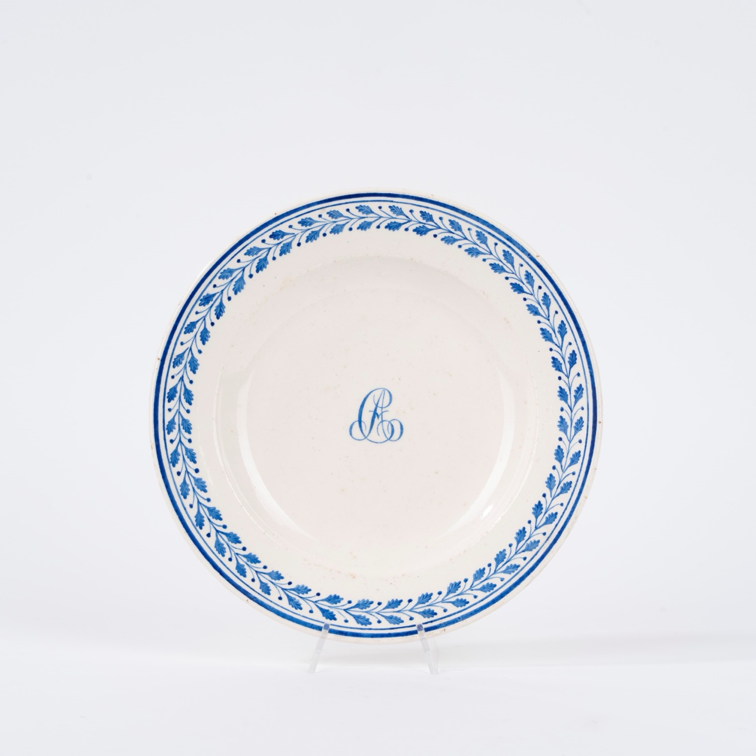 Piatto in maiolica bianca con monogramma blu, Del Vecchio, Napoli secolo XIX