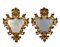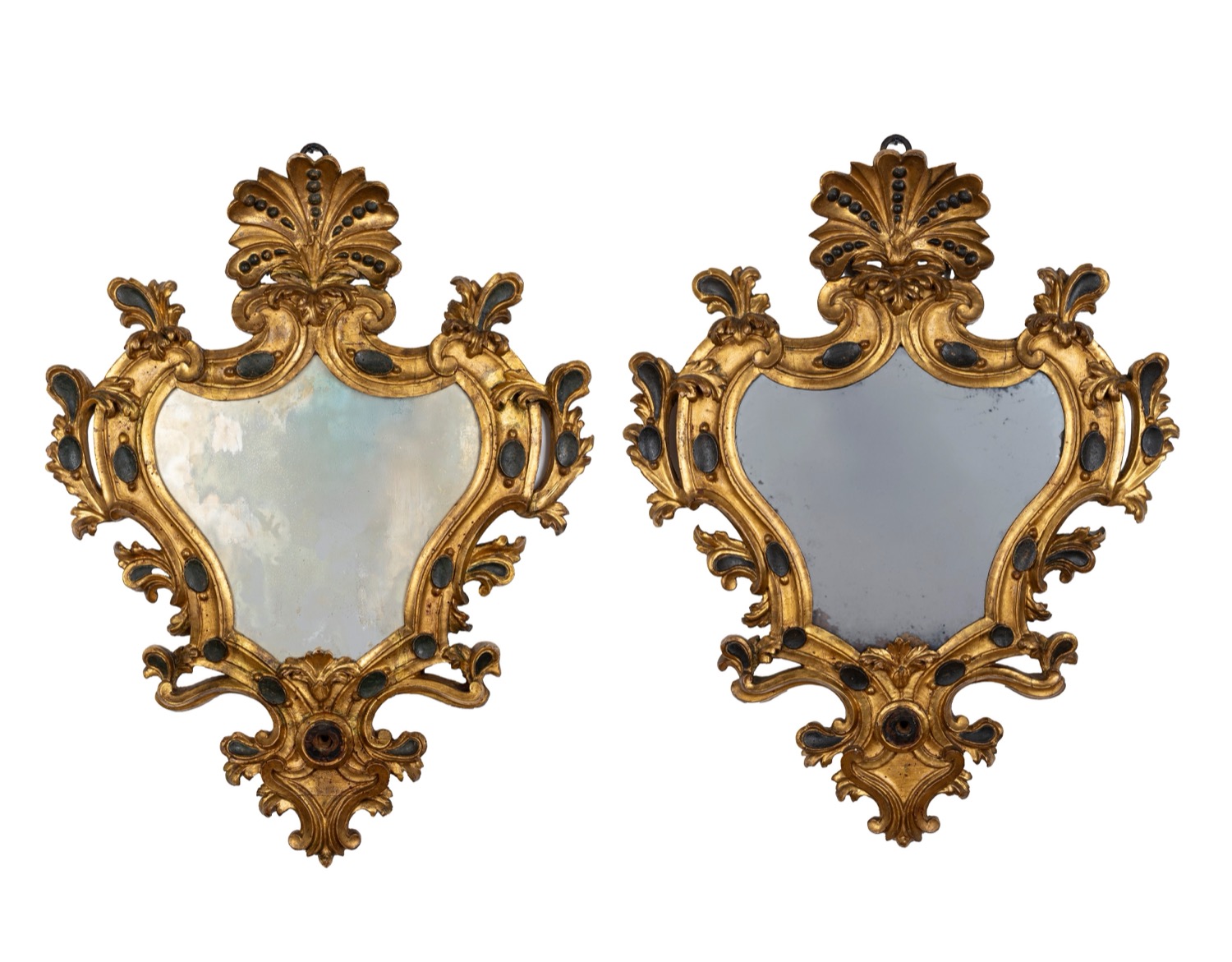 Coppia di specchiere di forma mossa in legno intagliato, dorato e dipinto a volute fogliate, cimasa a palmetta, secolo XIX