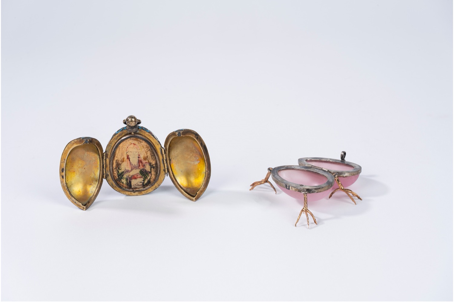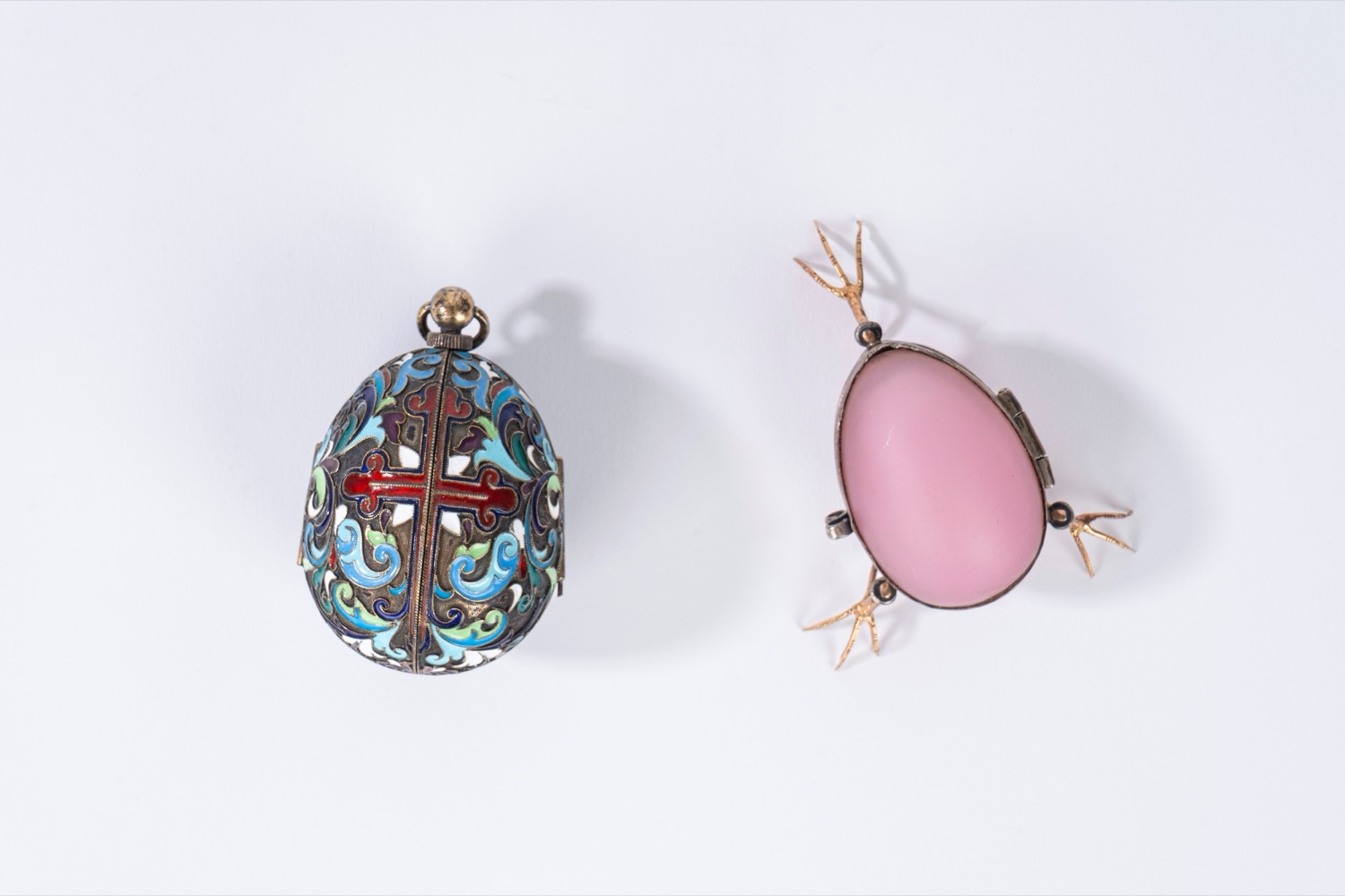 l'uovo con smalti policromi a motivi vegetali, interno in vermeil con miniatura raffigurante santo, punzone kokoshnik 1899-1908, argentiere non identificato; la scatola con coperchio apribile su tre zampe con punzone OP (Otto Reinhold Pettilius, S. Pietroburgo 1838-1874) e purity mark "88" l'uovo con smalti policromi a motivi vegetali, interno in vermeil con miniatura raffigurante santo, punzone kokoshnik 1899-1908, argentiere non identificato; la scatola con coperchio apribile su tre zampe con punzone OP (Otto Reinhold Pettilius, S. Pietroburgo 1838-1874) e purity mark "88"
