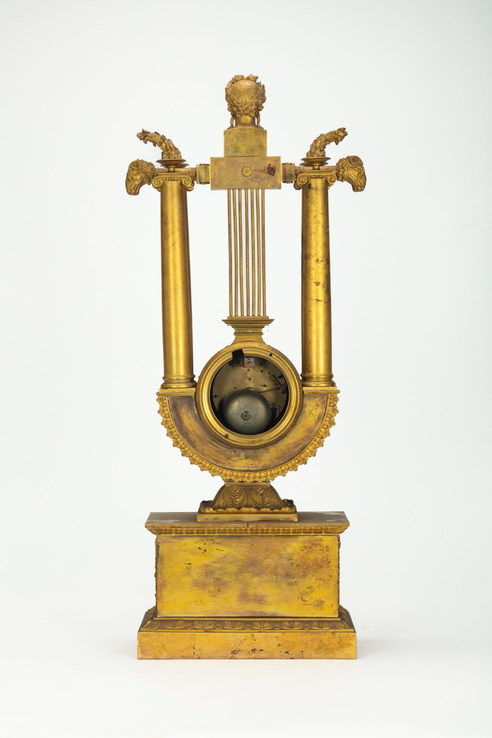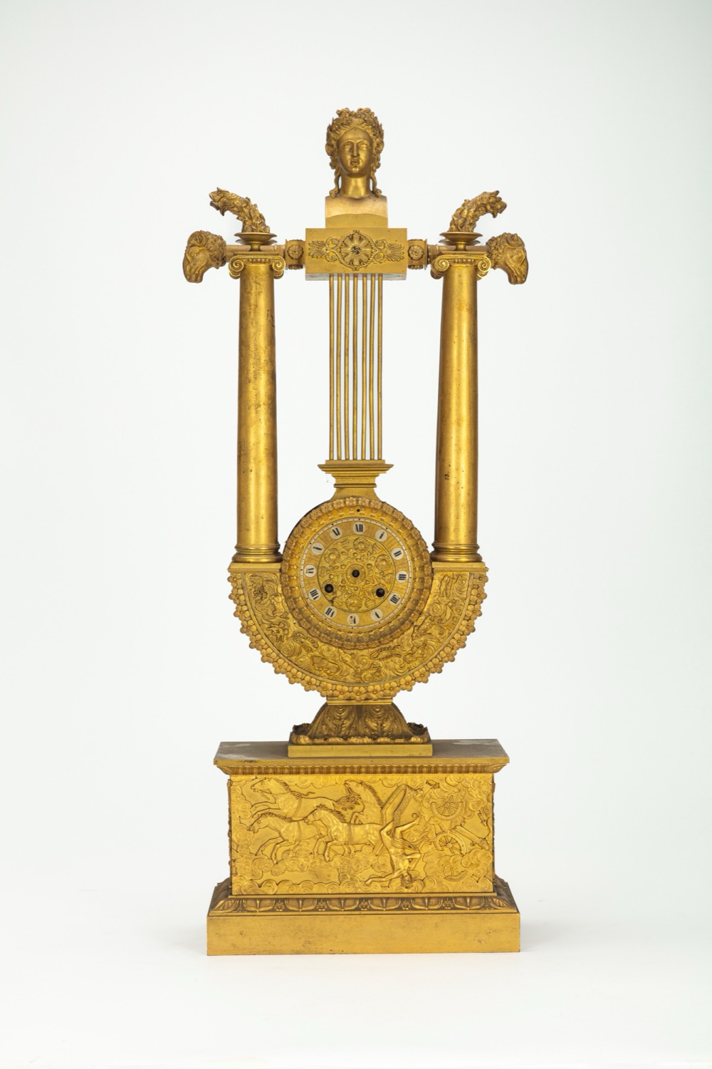 base a plinto decorata da scena mitologica, reggente lira sormontata da busto muliebre e teste caprine. Quadrante a numeri romani, movimento a tre treni con suoneria su campanello